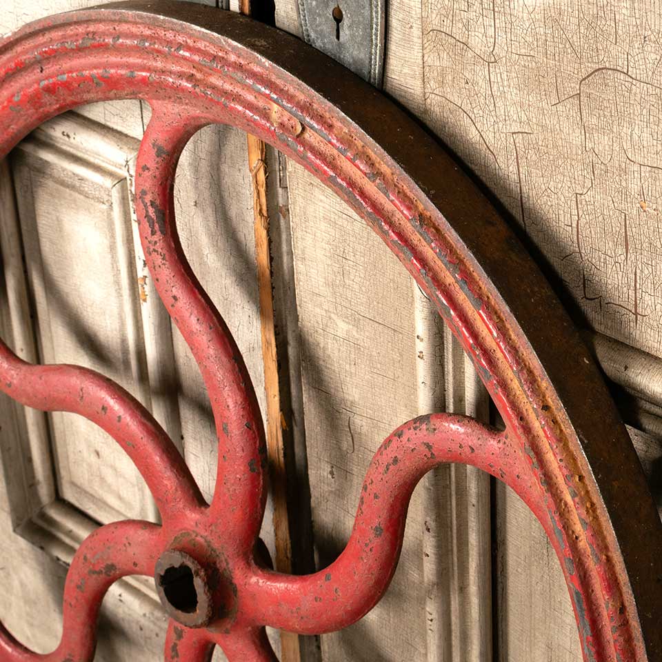 Architectural salvage antique cast iron belt wheel measuring approx. 31 3/4" in diameter x 1 1/2" thick (2 1/2" thick at center). See photos to evaluate condition.