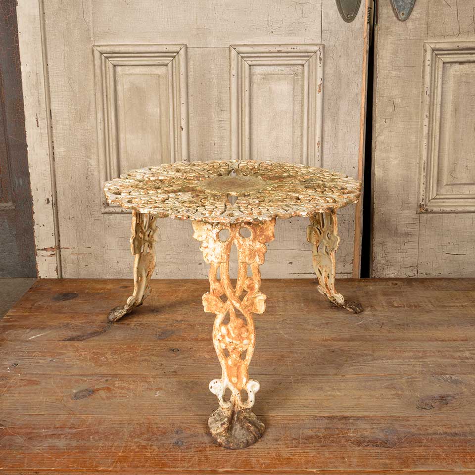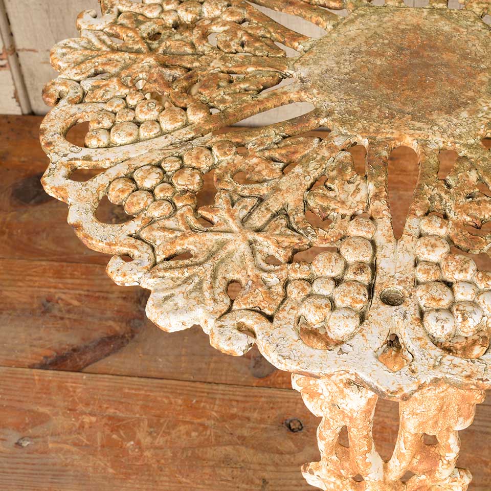Architectural salvage vintage painted cast iron garden table with grape motif measuring approx. 14 3/8" tall with a 20 1/2" diameter top and a 25" diameter base. See photos to evaluate condition.