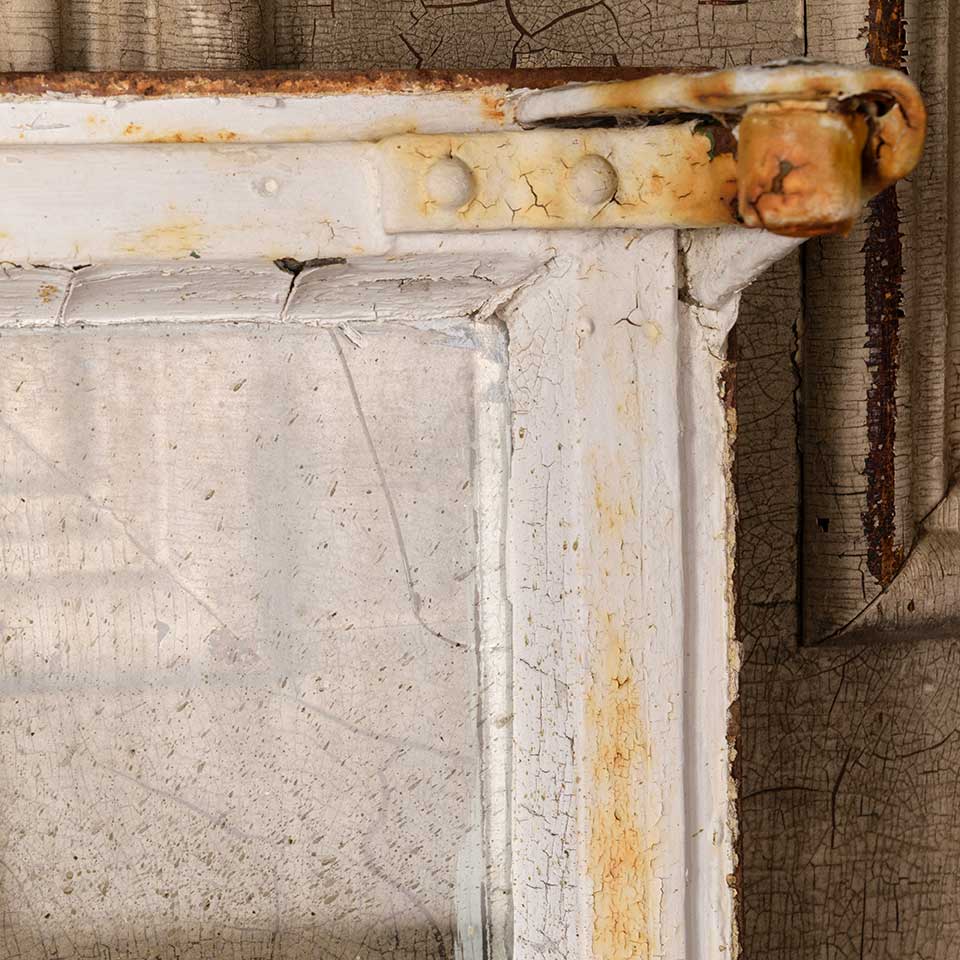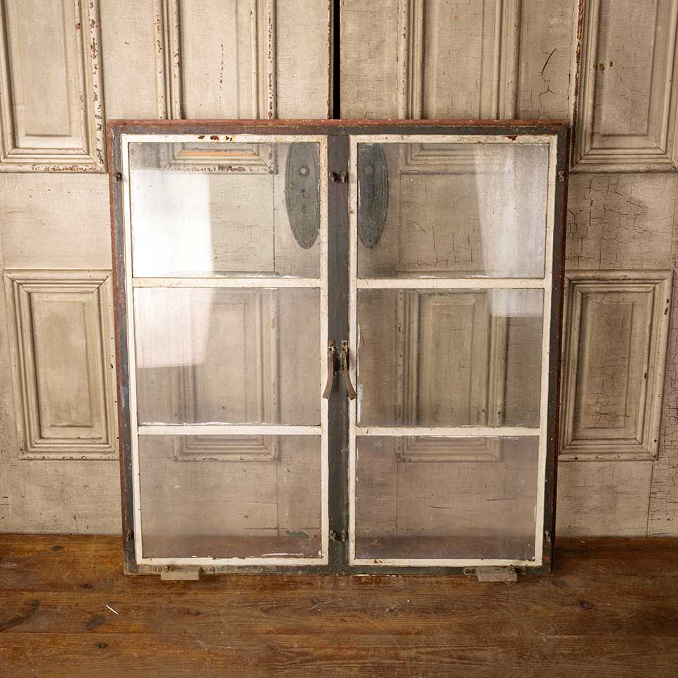 Architectural salvage vintage divided six lite steel casement window measuring approx. 37" wide x 38 3/8" tall x 1 1/4" front to back. One glass pane is cracked. See photos to evaluate condition.