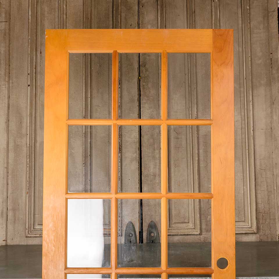 Architectural salvage fifteen lite pine wood interior French door measuring approx. 35 3/4" wide x 80" tall x 1 3/8" thick. This is not an antique door. See photos to evaluate condition.