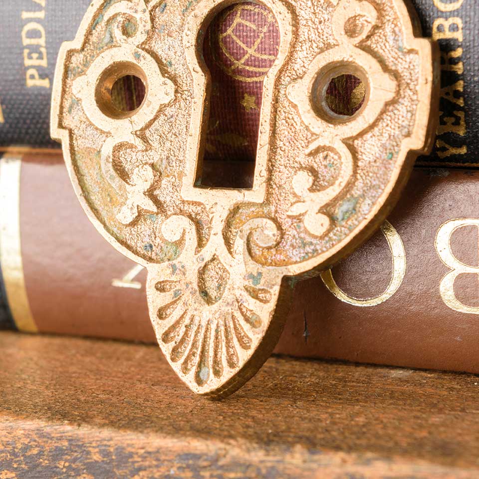Architectural salvage antique ornate bronze door keyhole escutcheon cover plate hardware measuring approx. 1 5/8" wide x 2 1/4" tall. See photos to evaluate condition.