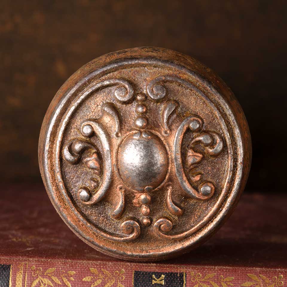 Architectural salvage antique cast iron Reading Hardware Reole pattern (circa 1905) doorknobs door hardware set including 2 matching doorknobs (2 1/4" in diameter with 3/4" diameter stems) and a tapped doorknob spindle with set screws. Color and condition may vary. Priced at $150/set.