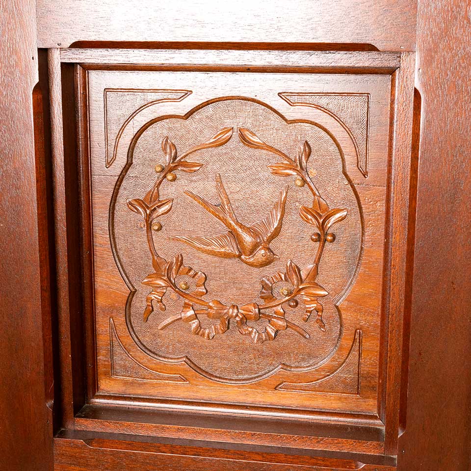 Architectural salvage beautiful dry bar constructed of walnut and antique carved relief panels with bird motif measuring approx. 97 1/4" wide x 43 1/2" tall x 26" front to back. Includes three barstools each measuring approx. 31 3/4" tall with a 17" diameter top. There's some separation of the corners on the bar top. See photos to evaluate condition.