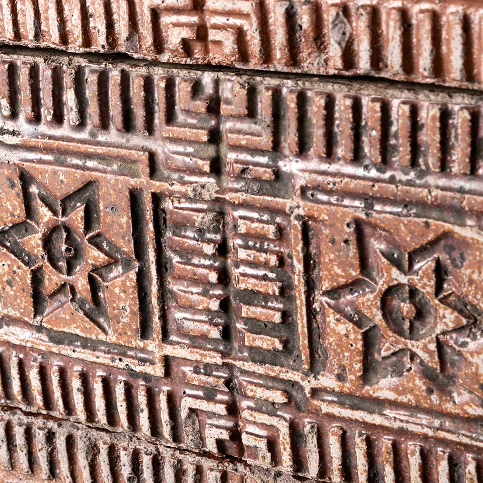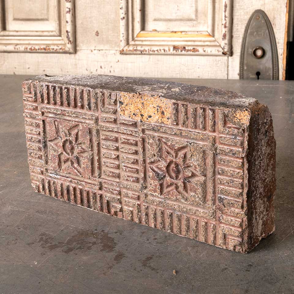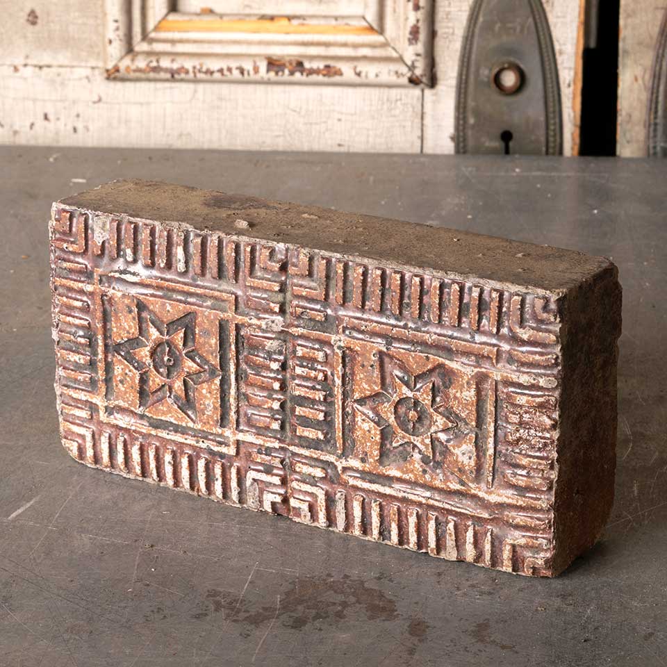 Architectural salvage antique salt glazed sidewalk paver brick with star pattern measuring approx. 10 1/4" wide x 4 7/8" tall x 2 1/2" thick. Color and condition varies.