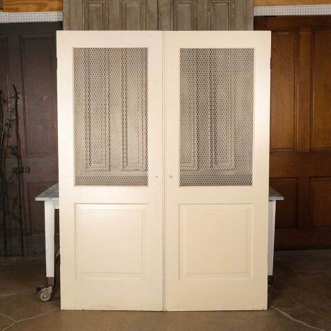 Architectural salvage vintage painted wood screen doors with metal wire screen panels together measuring approx. 60 3/16" wide x 79 7/8" tall x 1 1/16" thick. See photos to evaluate condition. Priced at $595 for the set of two doors.