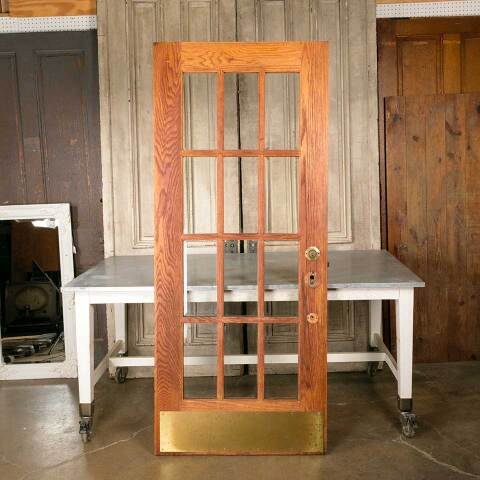 Architectural salvage antique twelve lite French entry door with beveled glass panes and mortise lock measuring approx. 34" wide x 80 1/2" tall x 1 3/4" thick. See photos to evaluate condition.
