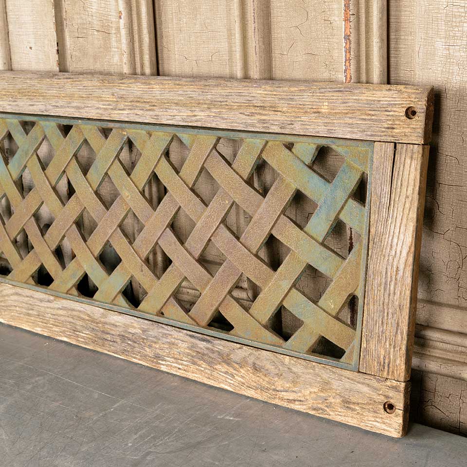 Salvaged wood framed cast iron lattice garden bench seat back measuring approx. 48" wide x 15" tall x 3/4" front to back. See photos to evaluate condition.
