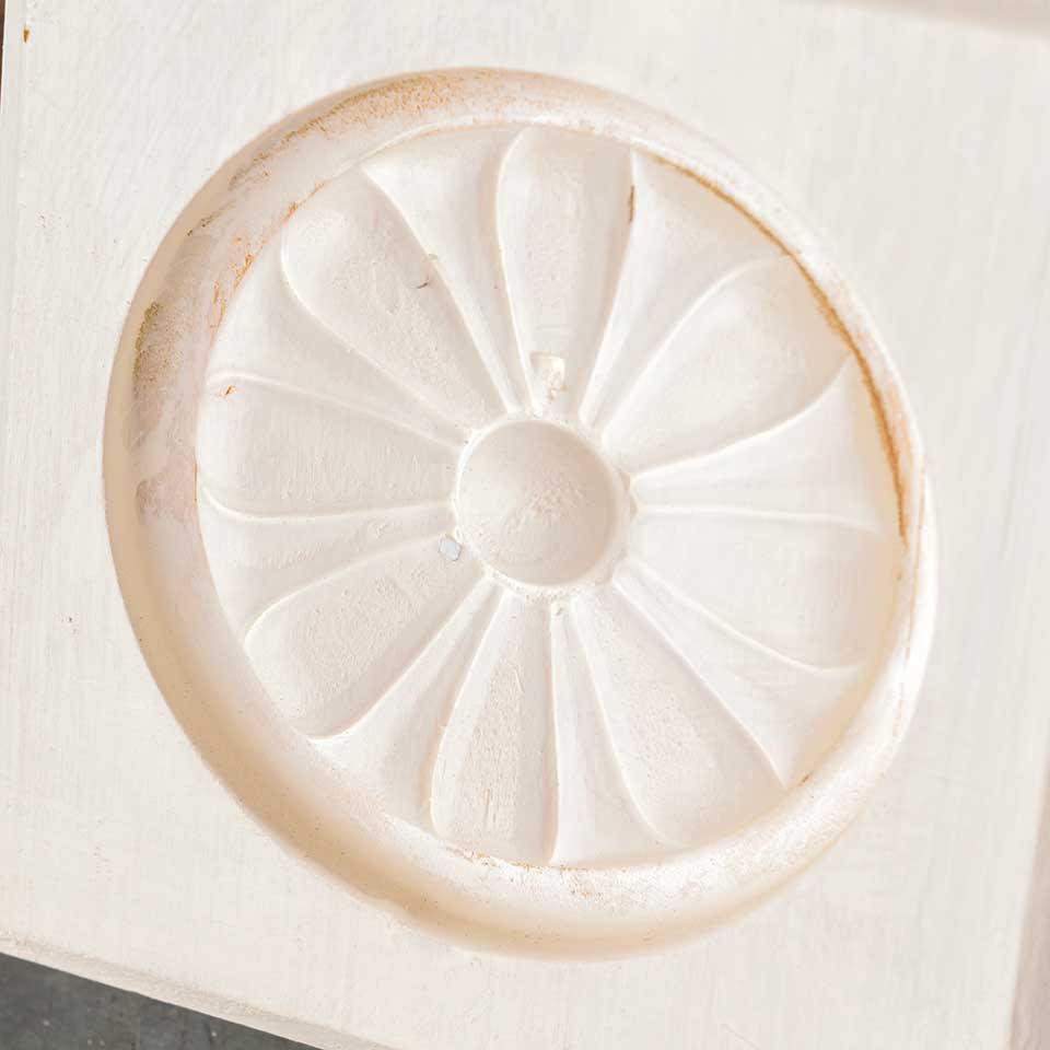 Architectural salvage small painted wood rosette interior window or door trim block with a flower motif measuring approx. 3 1/2" x 3 1/2" x 1 1/8" front to back. Color and condition may vary.
