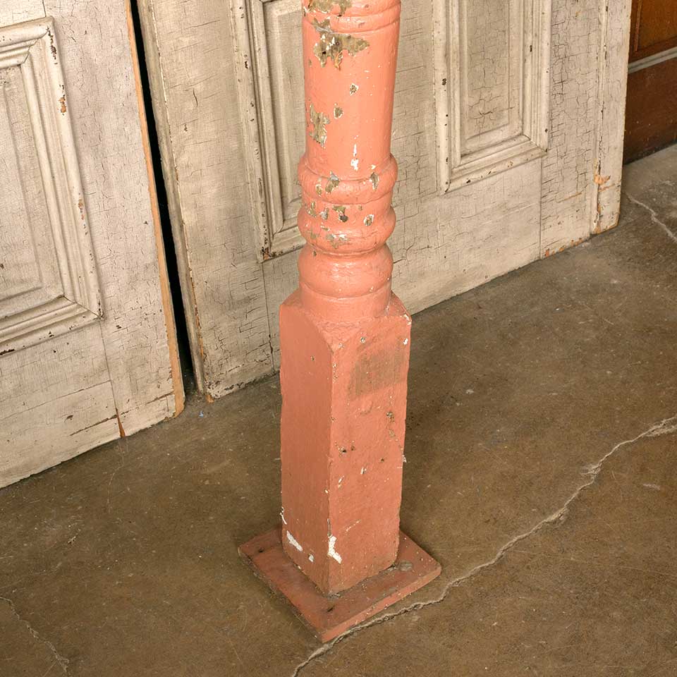 Architectural salvage antique turned wood porch post measuring approx. 4 1/2" x 4 1/2" x 86 3/8" tall with a 7 7/8" x 7 7/8" piece nailed to the bottom. See photos to evaluate condition.
