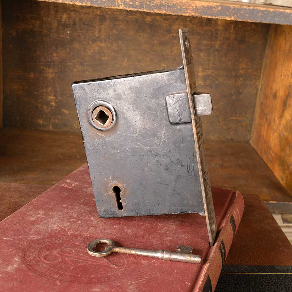 Architectural salvage antique Reading Hardware Co. Windsor pattern (c. 1897) cast iron reversible interior door mortise latch lock hardware set. Measurements: face plate 7/8" wide x 5 1/2" tall x 1/16" thick and body 5/8" wide x 3 3/4" tall x 3 1/8" front to back with a 2 1/2" backset. The distance between the spindle and keyholes is 2 1/2" on center. Skeleton key included. Color and condition may vary. Priced at $55/set.
