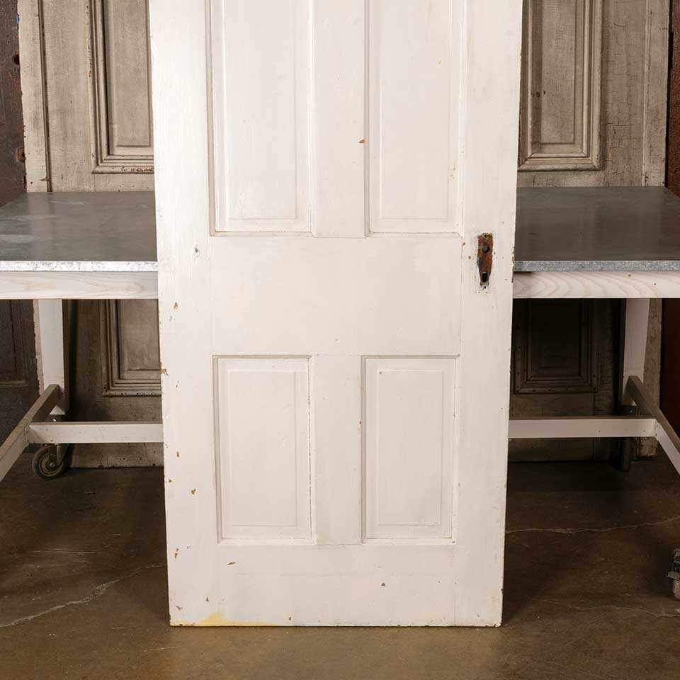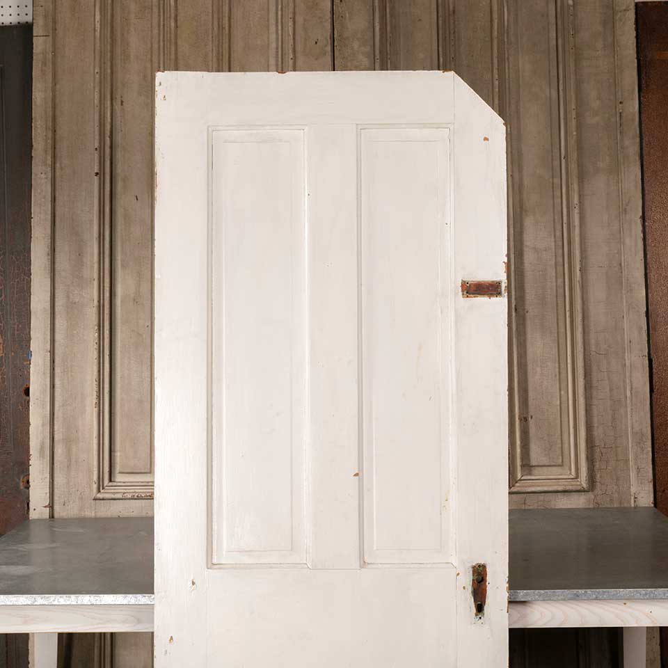 Architectural salvage antique four panel wood interior door with mortise lock measuring approx. 30" wide x 77 1/2" tall x 1 3/8" thick. One of the top corners is clipped. See photos to evaluate condition.