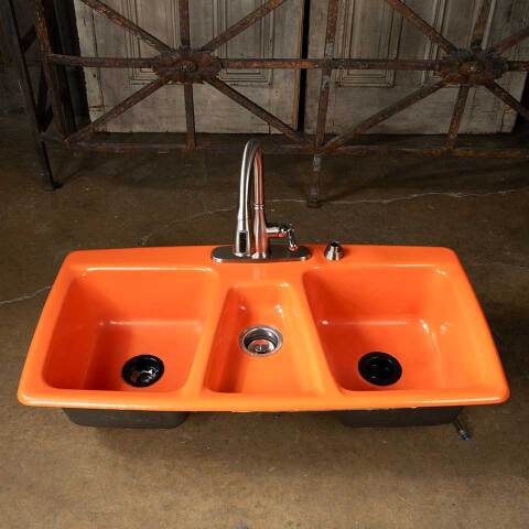 Architectural salvage vintage mid-century modern orange drop-in cast iron kitchen sink measuring approx. 43" wide x 9 1/2" tall x 22 1/4" front to back. Fixtures are included, but not guaranteed to be in working order. See photos to evaluate condition.