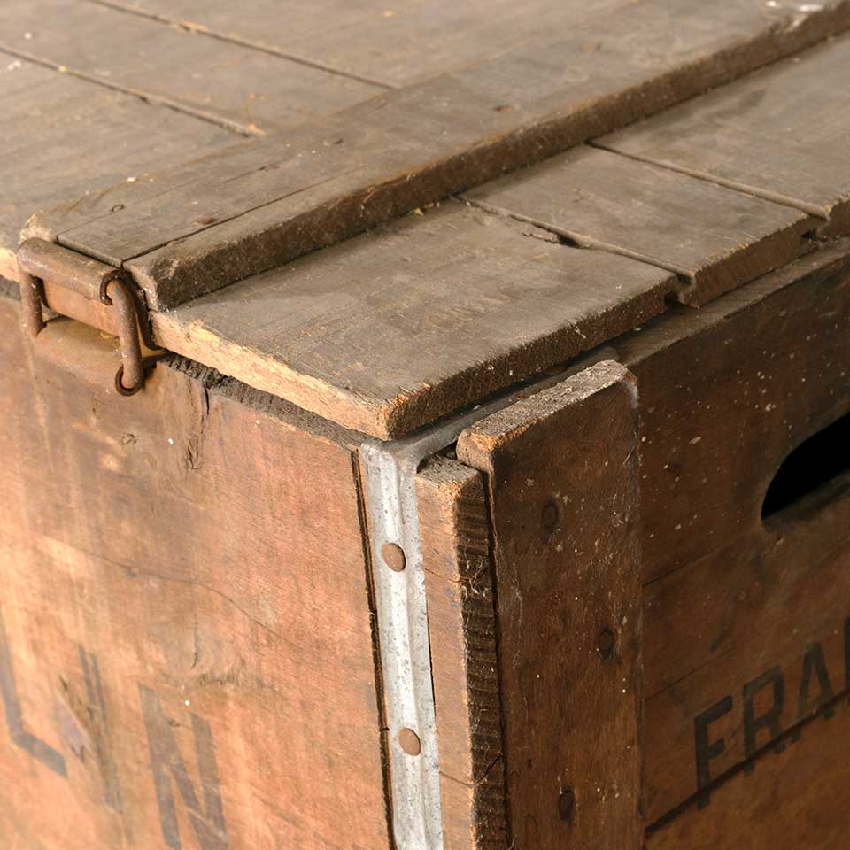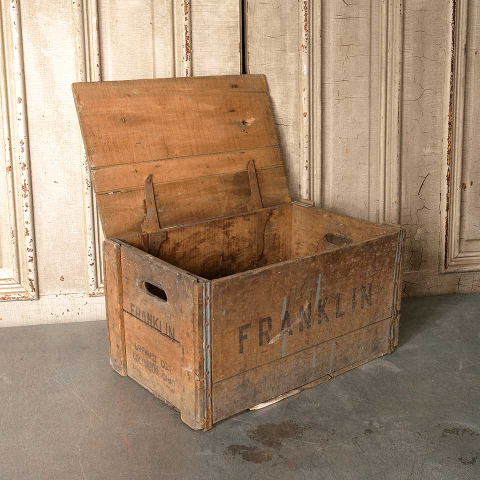 Antique wood beer bottle advertising crate with hinged lid and hand holds measuring approx. 19 5/8" wide x 11" tall x 12" front to back. Marked FRANKLIN BREWING CO COLUMBUS OHIO. There's a large hole in one bottom corner. See photos to evaluate condition.
