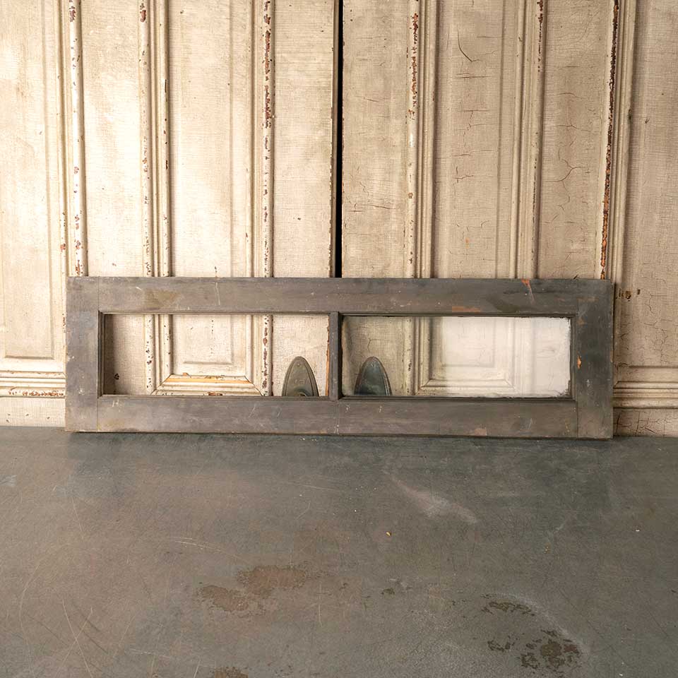 Architectural salvage antique divided two lite wood transom window measuring approx. 40" wide x 11 1/2" tall x 1 1/4" thick. One of the glass panes is missing. See photos to evaluate condition.