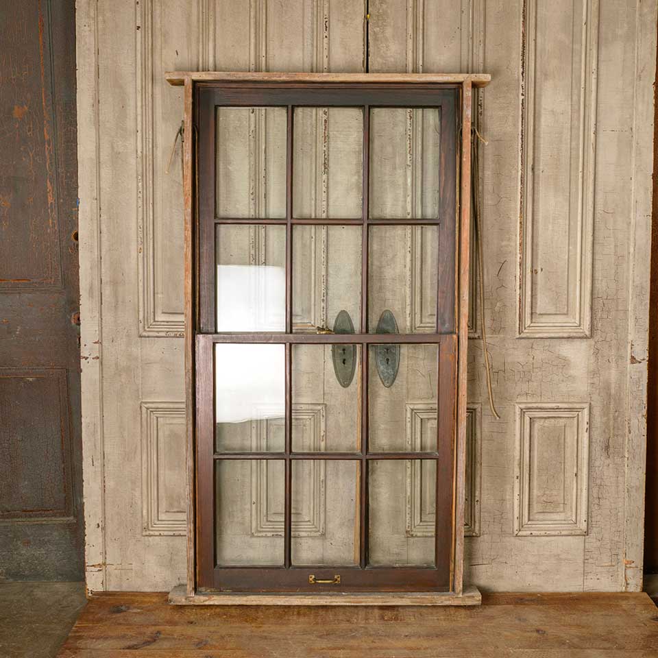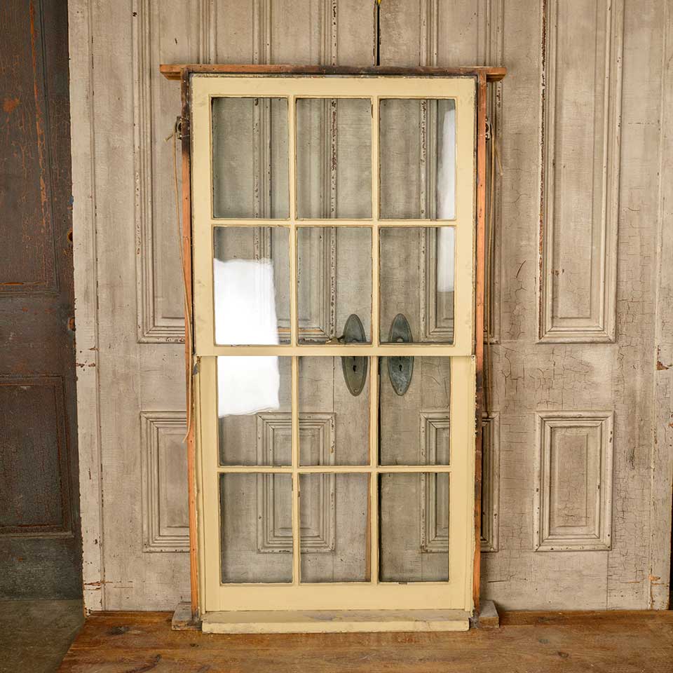 Architectural salvage antique double hung divided six lite wood window unit measuring approx. 34 1/4" wide (38 7/8" overall) x 65" tall x 4 3/8" front to back. See photos to evaluate condition.