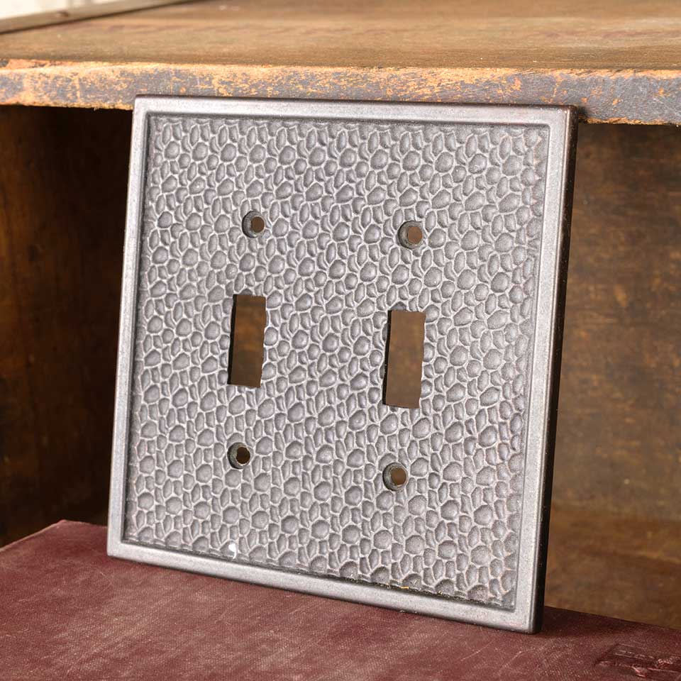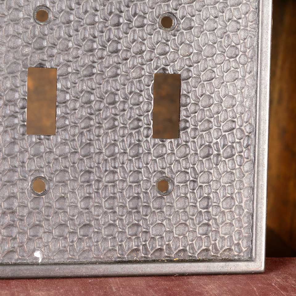 Architectural salvage vintage hammered brass double light switch cover plate hardware measuring approx. 5" wide x 5" tall x 1/4" front to back. See photos to evaluate condition.