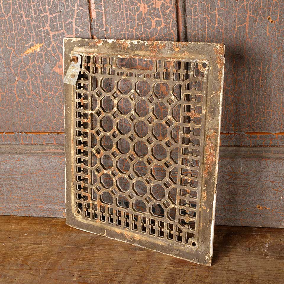 Architectural salvage antique cast iron heat grate floor vent cover measuring approx. 10" x 12" (insert dimensions) and 12" x 14" (overall dimensions). There are no louvers with this heat grate. See photos to evaluate condition.