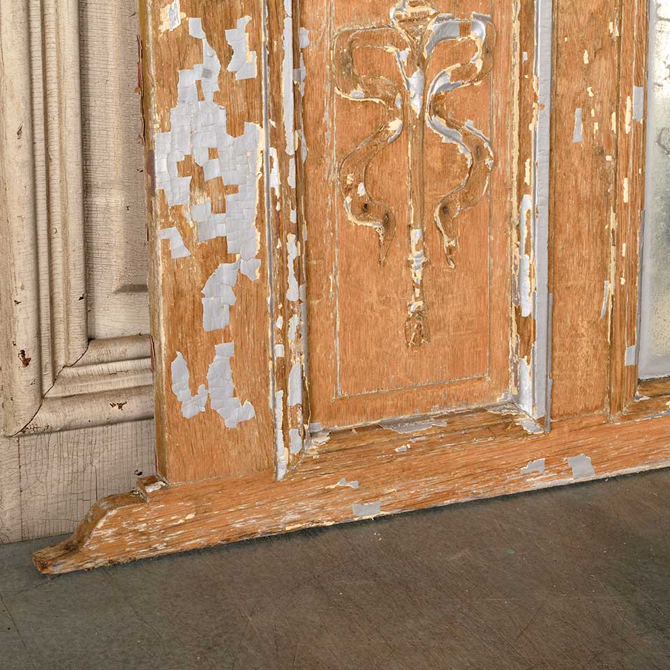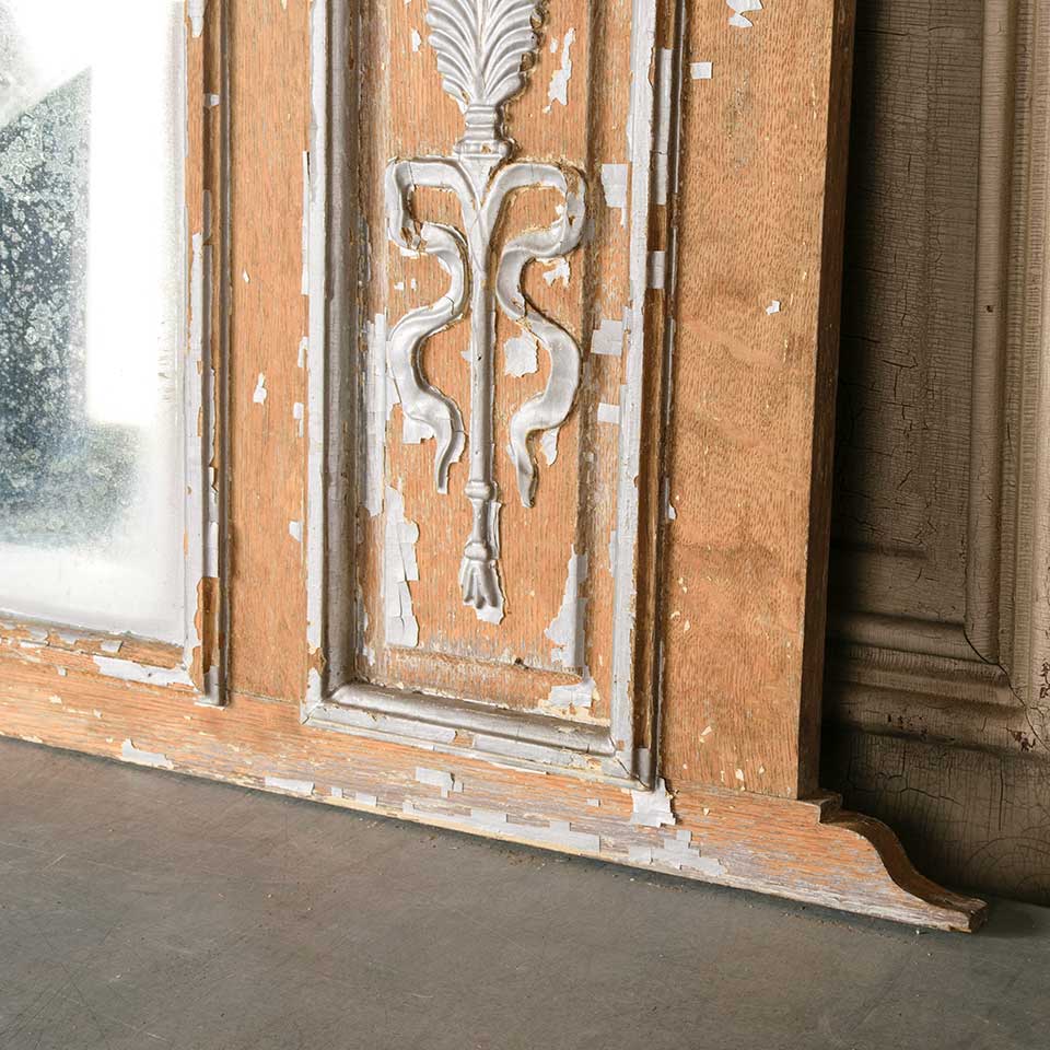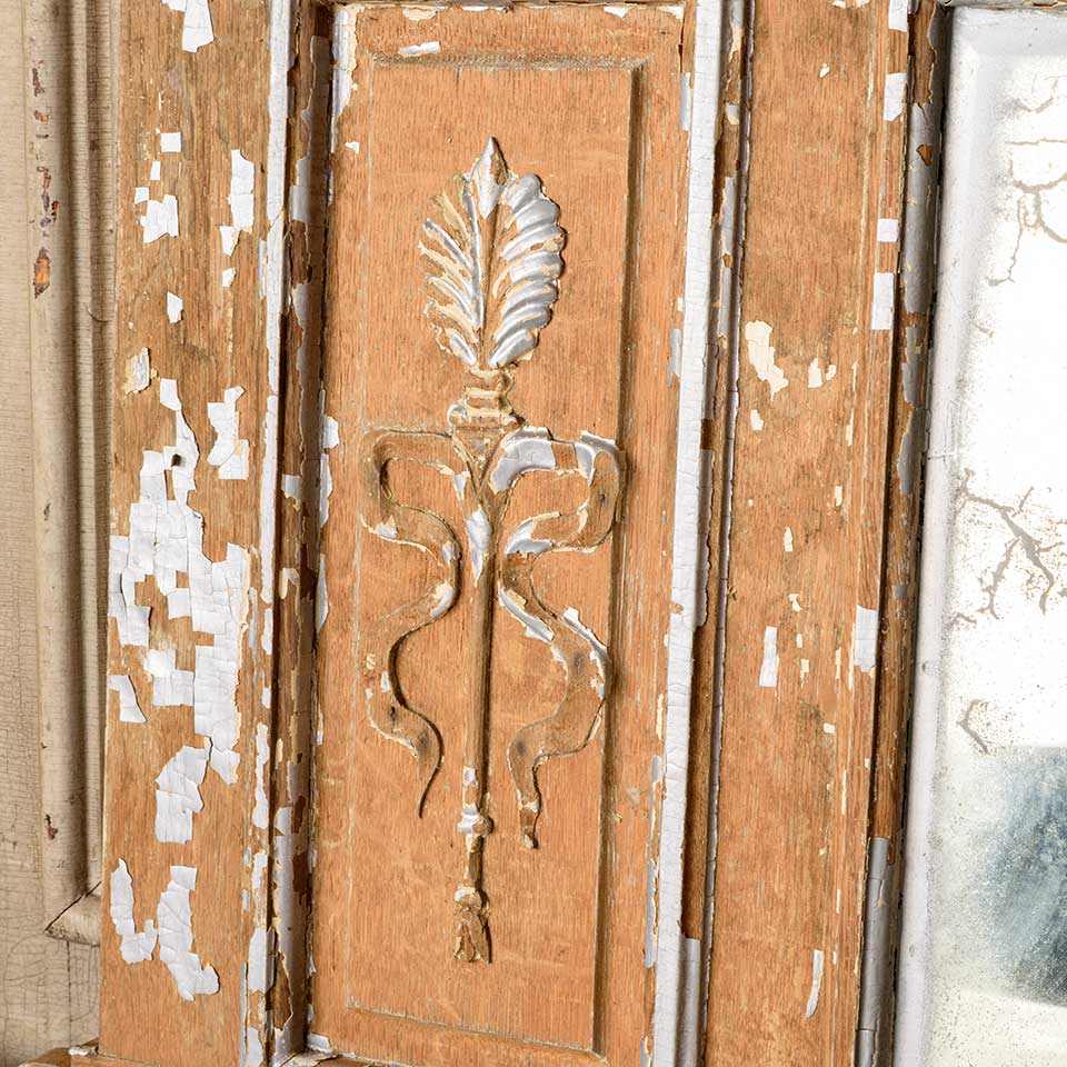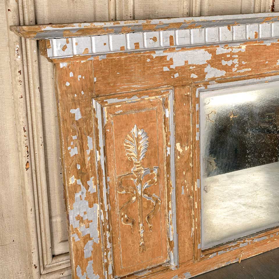 Architectural salvage antique painted wood over mantel / mantle mirror measuring approx. 57" wide x 23 1/2" tall x 2 3/4" front to back. See photos to evaluate condition.