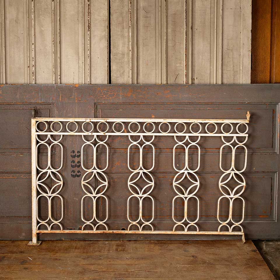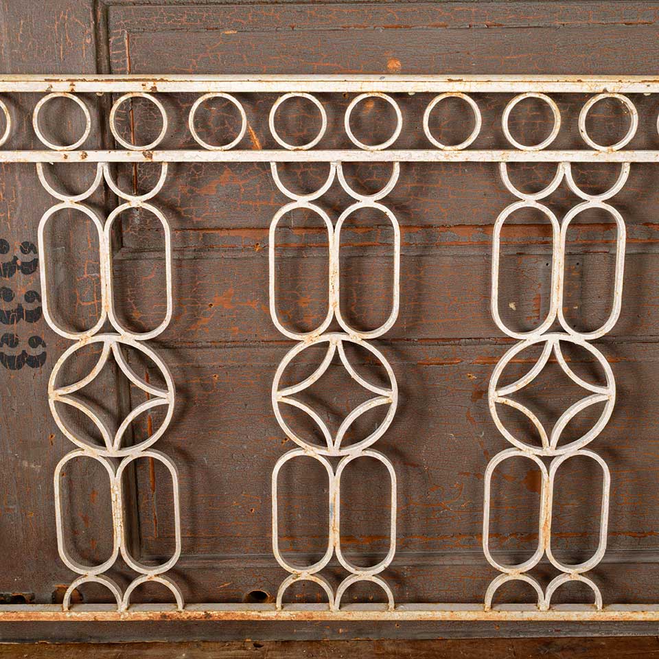 Architectural salvage vintage painted wrought iron railing with brass finial measuring approx. 54 1/2" wide x 32 3/8" tall (to top of railing) x 1" front to back. See photos to evaluate condition.