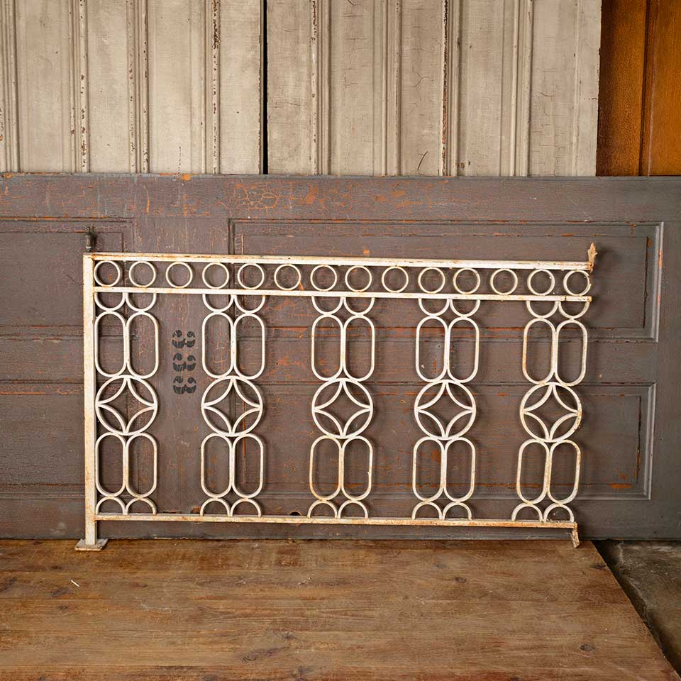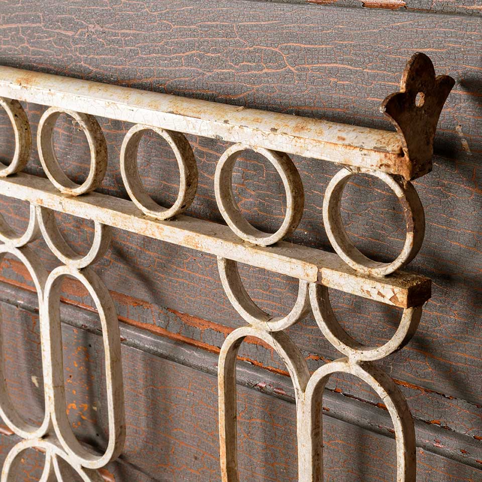 Architectural salvage vintage painted wrought iron railing with brass finial measuring approx. 54 1/2" wide x 32 3/8" tall (to top of railing) x 1" front to back. See photos to evaluate condition.