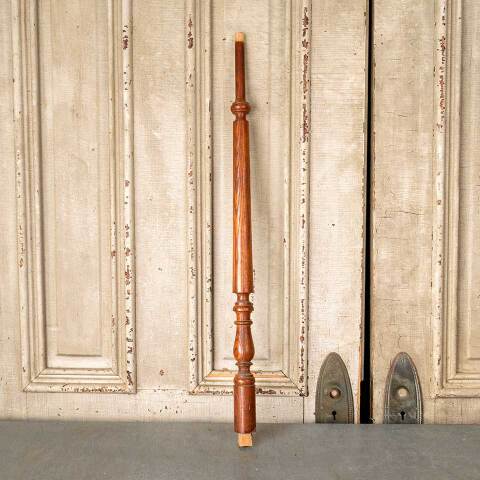 Architectural salvage antique turned oak staircase baluster measuring approx. 32" tall with a 3/4" diameter top and a 1 3/4" diameter base. Color and condition may vary.