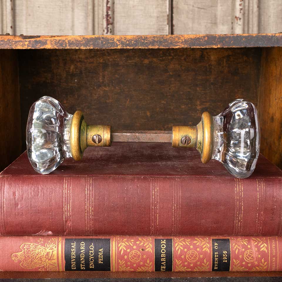 Pair of architectural salvage antique octagonal glass and brass doorknobs hardware with a unique convex face each measuring approx. 2 1/4" in diameter with a 11/16" diameter stem. The pair includes a tapped spindle with set screws. Color and condition may vary. Priced at $95/pair.