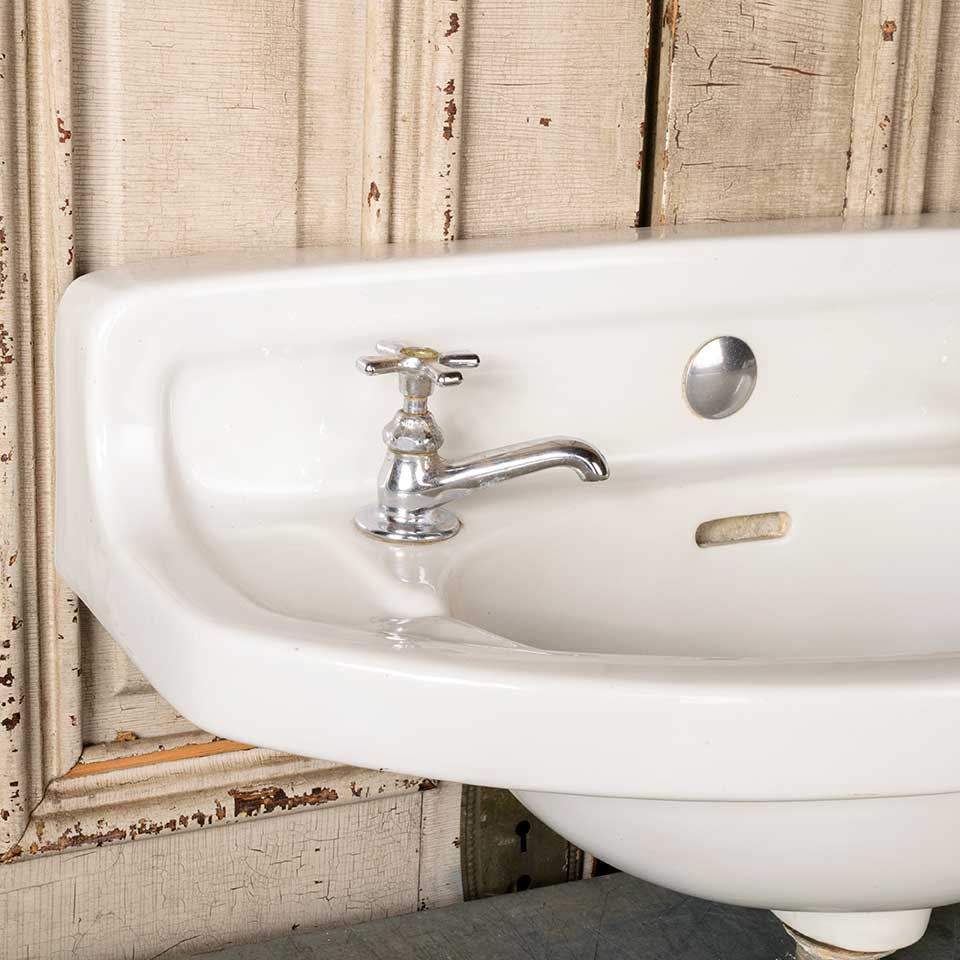 Architectural salvage antique porcelain wall mount curved front bathroom sink measuring 26 1/2" wide x 13" tall x 14" front to back. Wall mounting brackets are included. See photos to evaluate condition.