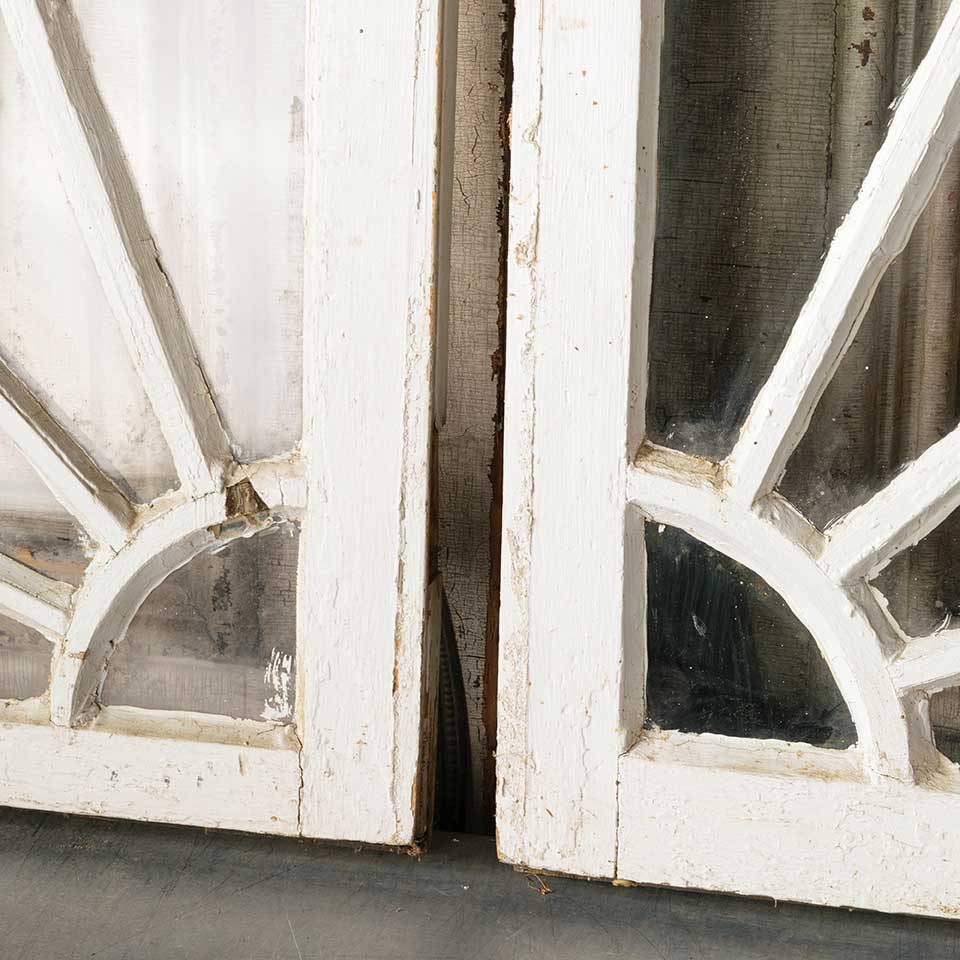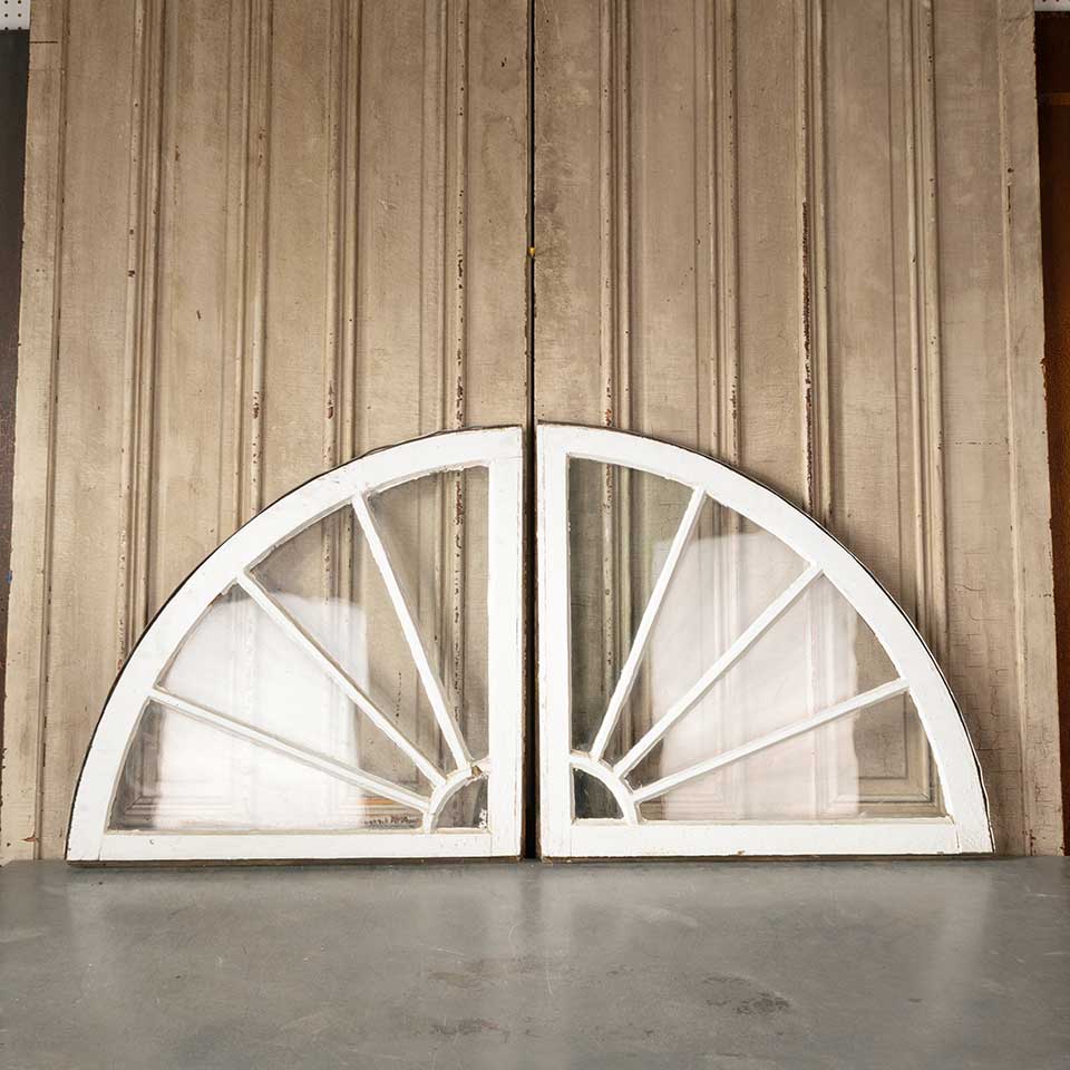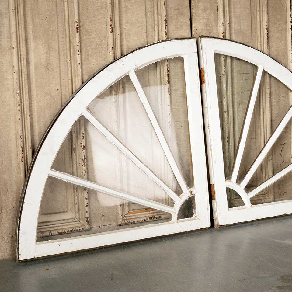 Pair of architectural salvage antique quarter circle / round divided lite wood window sashes each measuring approx. 29 3/4" wide x 29 3/4" tall x 1 1/4" front to back. There's one cracked pane of glass. See photos to evaluate condition. Priced at $550 for the pair.