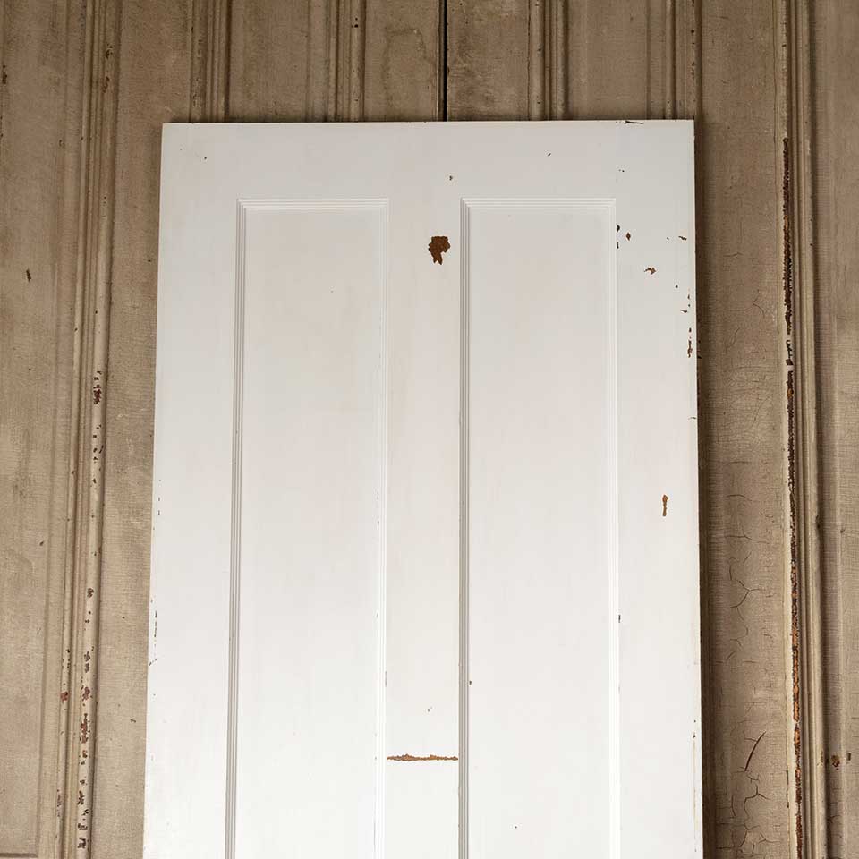 Architectural salvage antique painted wood vertical two panel interior door with mortise lock measuring approx. 30" wide x 79 1/8" tall x 1 3/8" thick. See photos to evaluate condition.