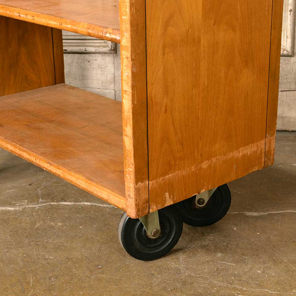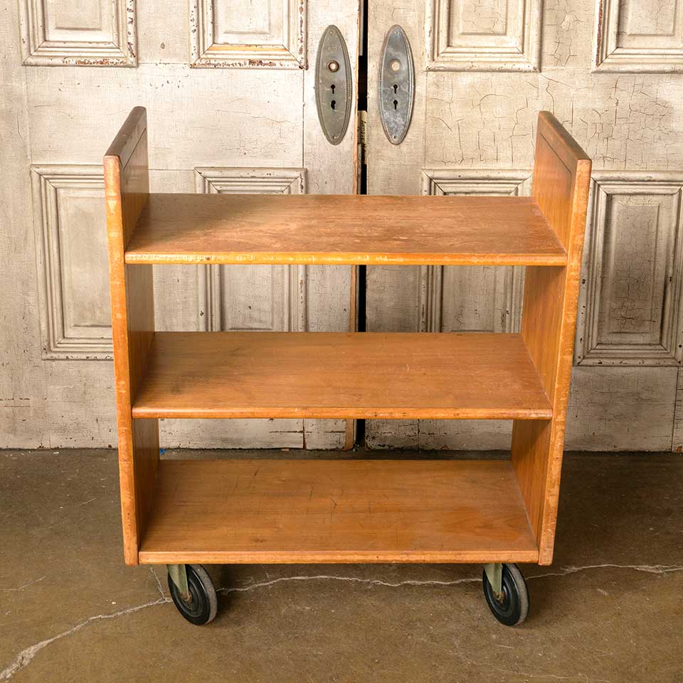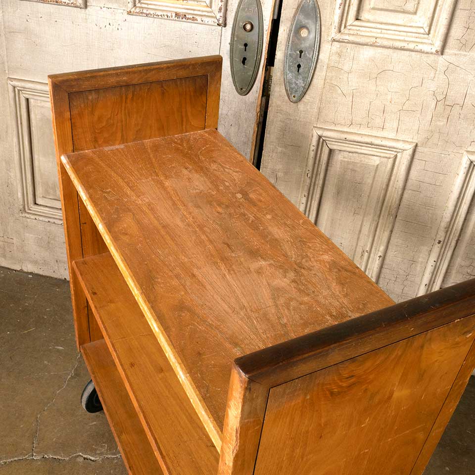 Architectural salvage vintage rolling wood library book cart measuring approx. 30" wide x 34 7/8" tall x 14 1/4" front to back. See photos to evaluate condition.