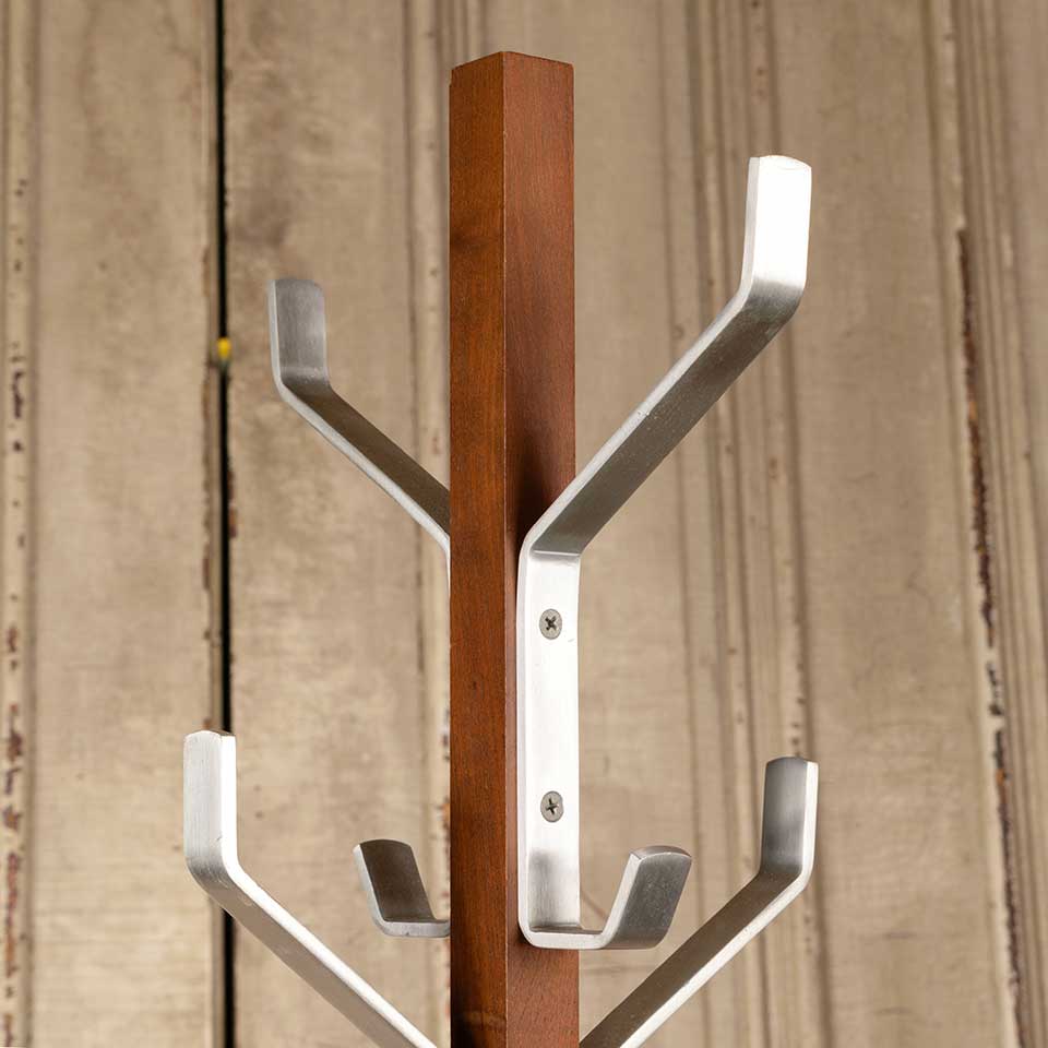 Architectural salvage vintage wood and metal hall tree coat and hat rack stand measuring approx. 69 5/8" tall with a 24" diameter base. See photos to evaluate condition.