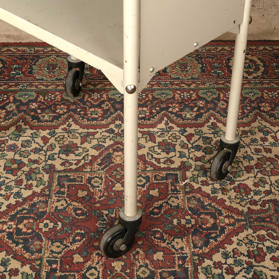 Architectural salvage vintage rolling metal library book cart measuring approx. 22 1/8" wide x 34 7/8" tall x 14 5/8" front to back. See photos to evaluate condition.