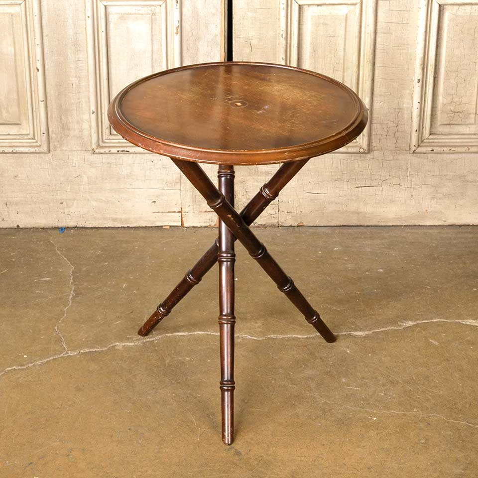 Vintage three legged round wood end table measuring approx. 24 3/4" tall with a 20" diameter top and a 19" diameter base. There's a hole in the center of the top. See photos to evaluate condition.