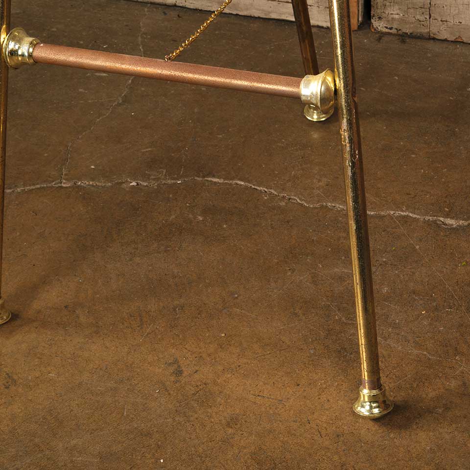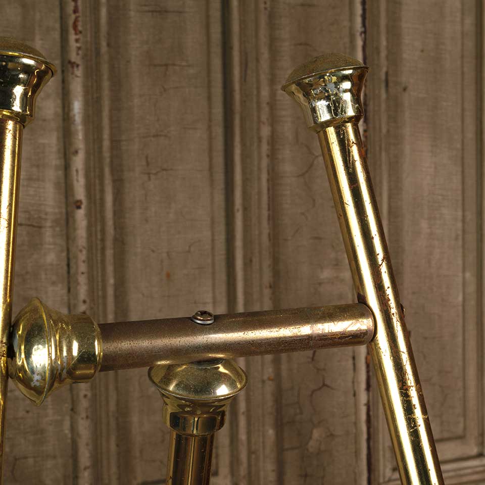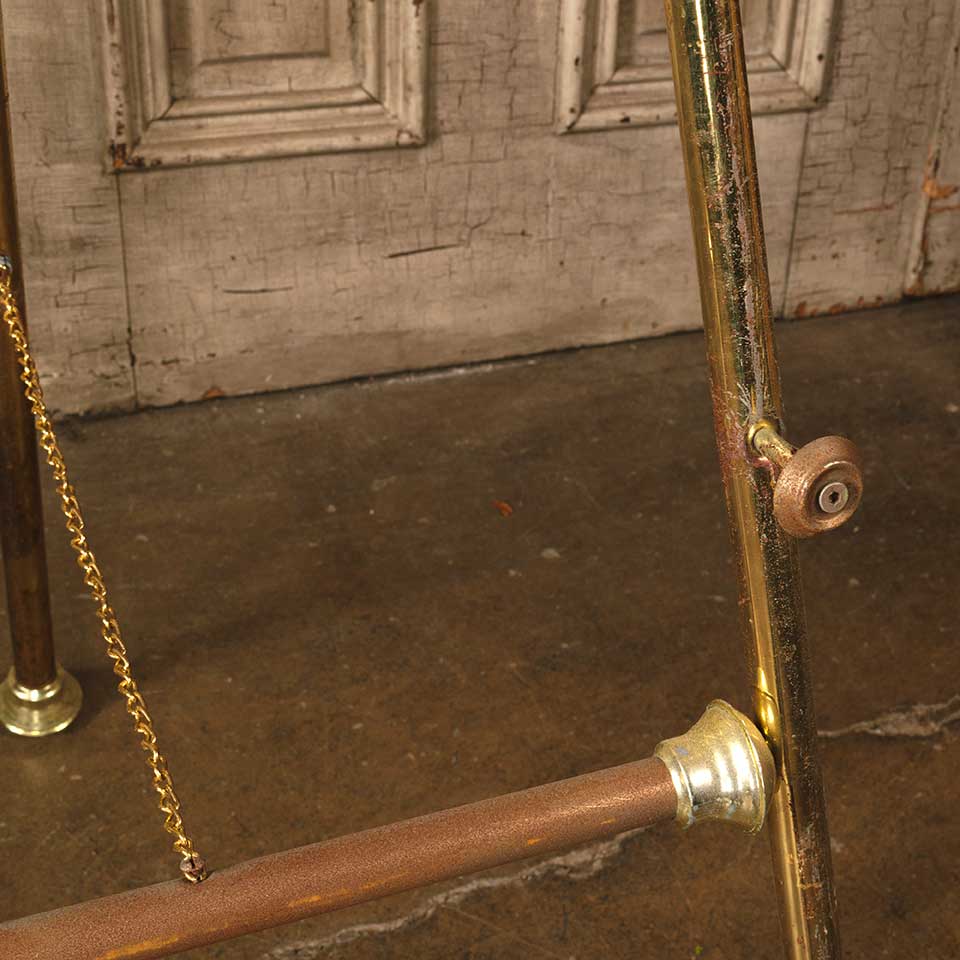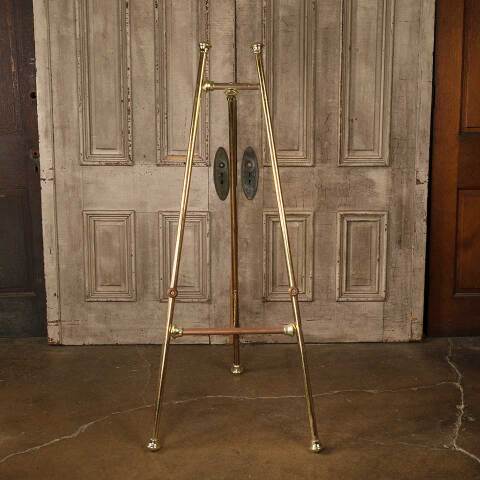 Folding metal art display easel measuring approx. 25 3/4" wide x 57" tall x 28" front to back (open). One of the upper ornaments on the horizontal piece is missing. See photos to evaluate condition.