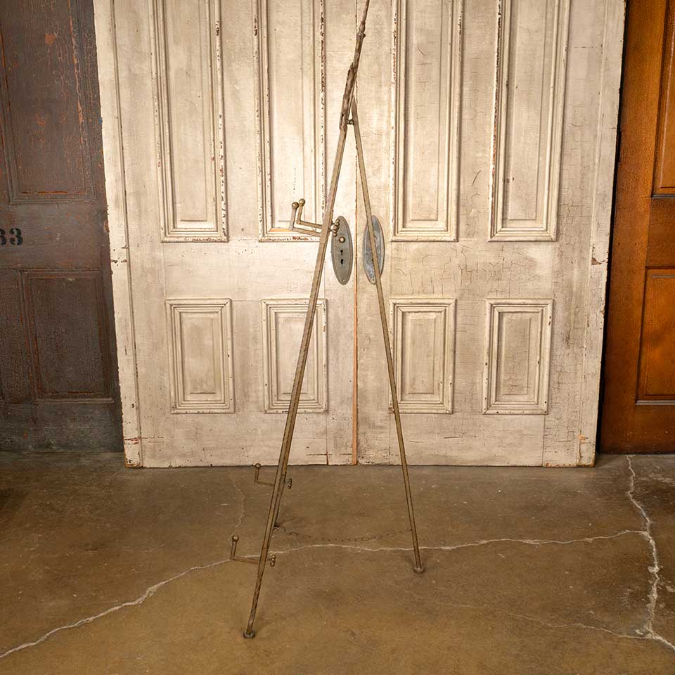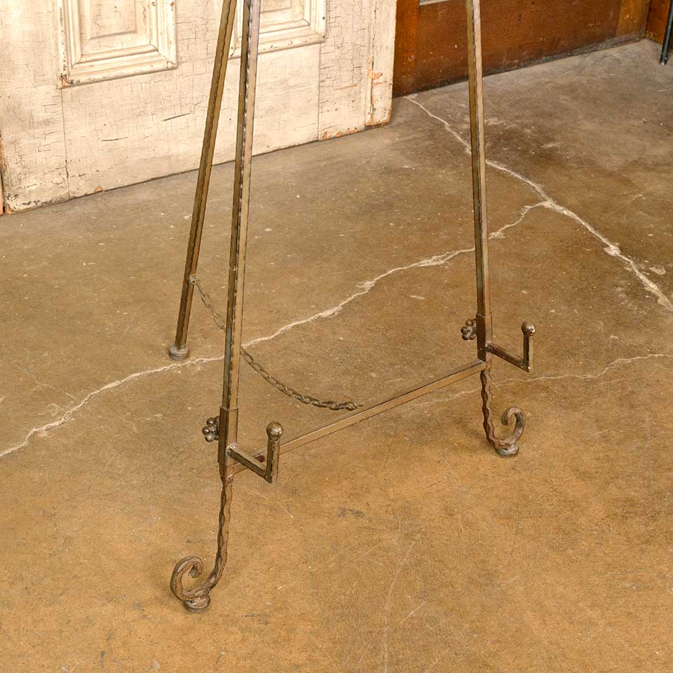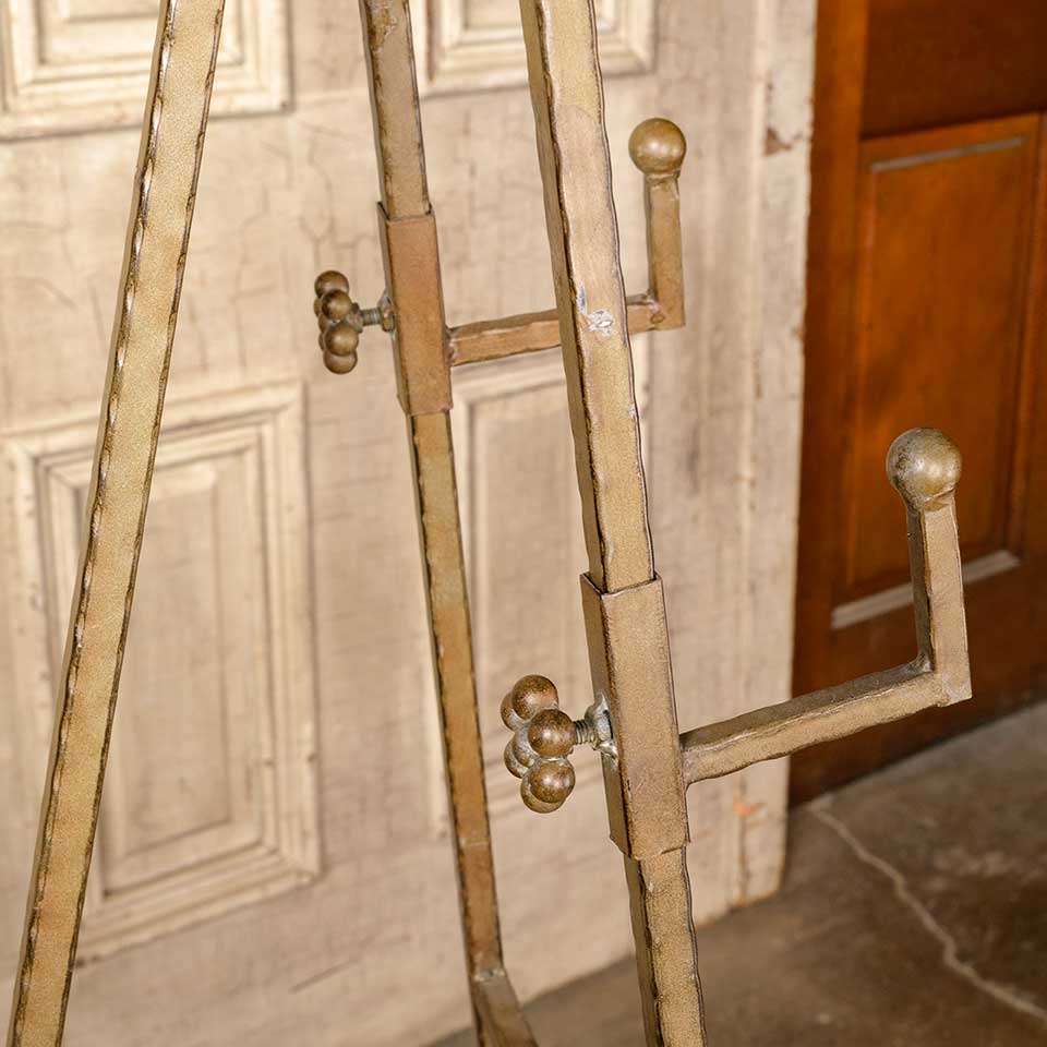 Ornate folding metal artwork easel with adjustable arms measuring approx. 24" wide x 63 3/4" tall x 22" front to back (when extended). See photos to evaluate condition.