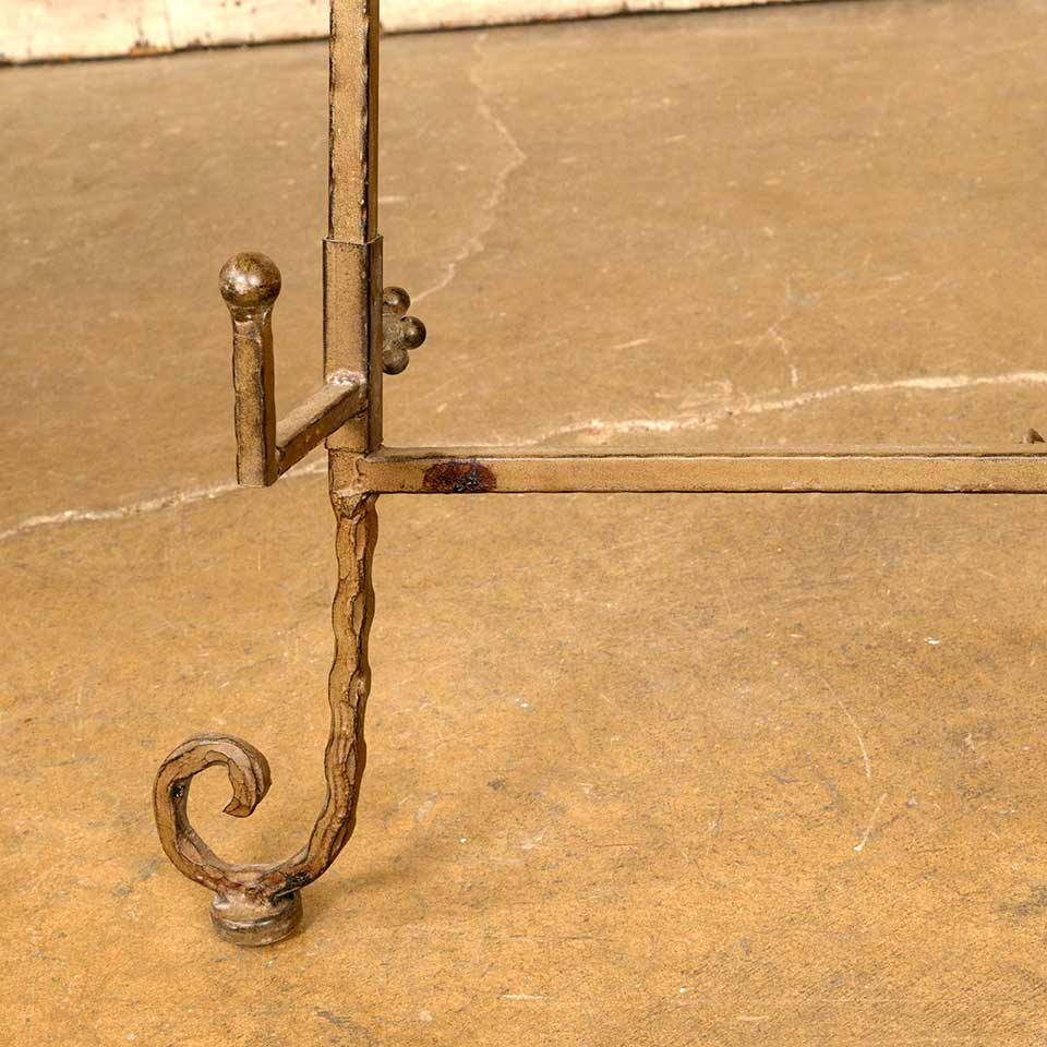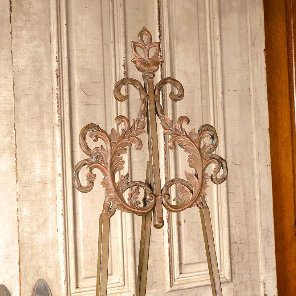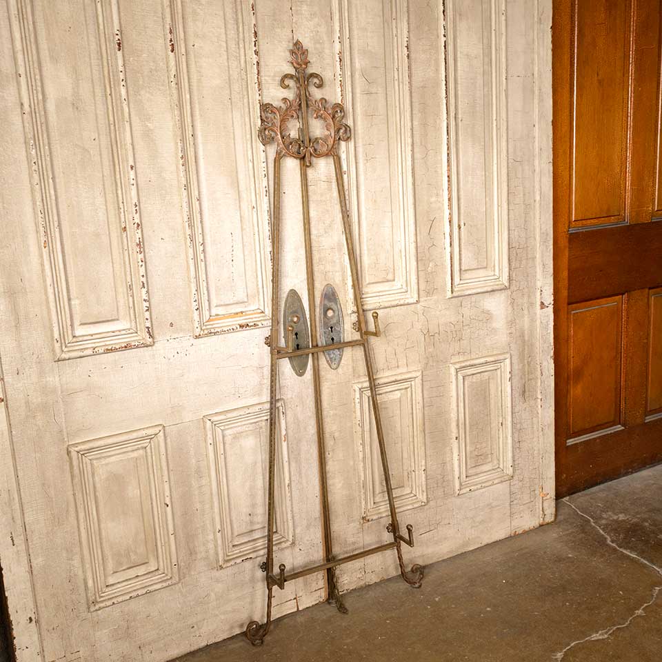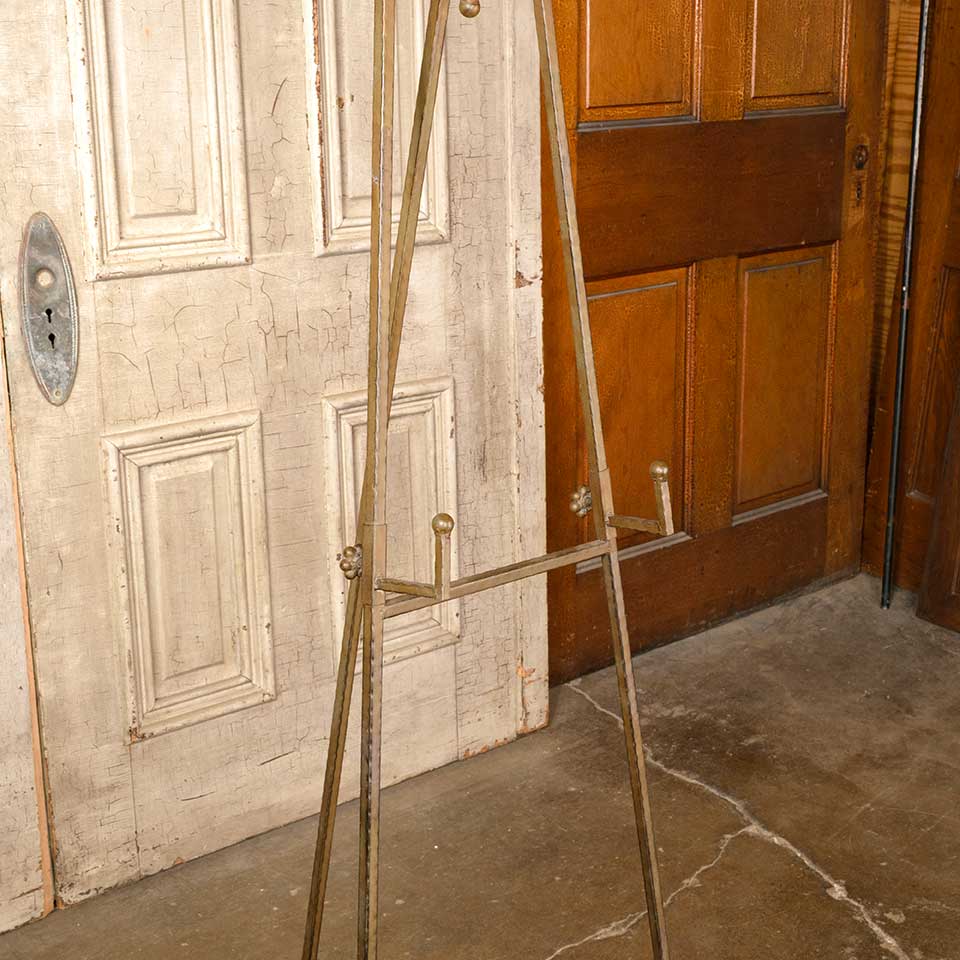 Ornate folding metal artwork easel with adjustable arms measuring approx. 24" wide x 63 3/4" tall x 22" front to back (when extended). See photos to evaluate condition.