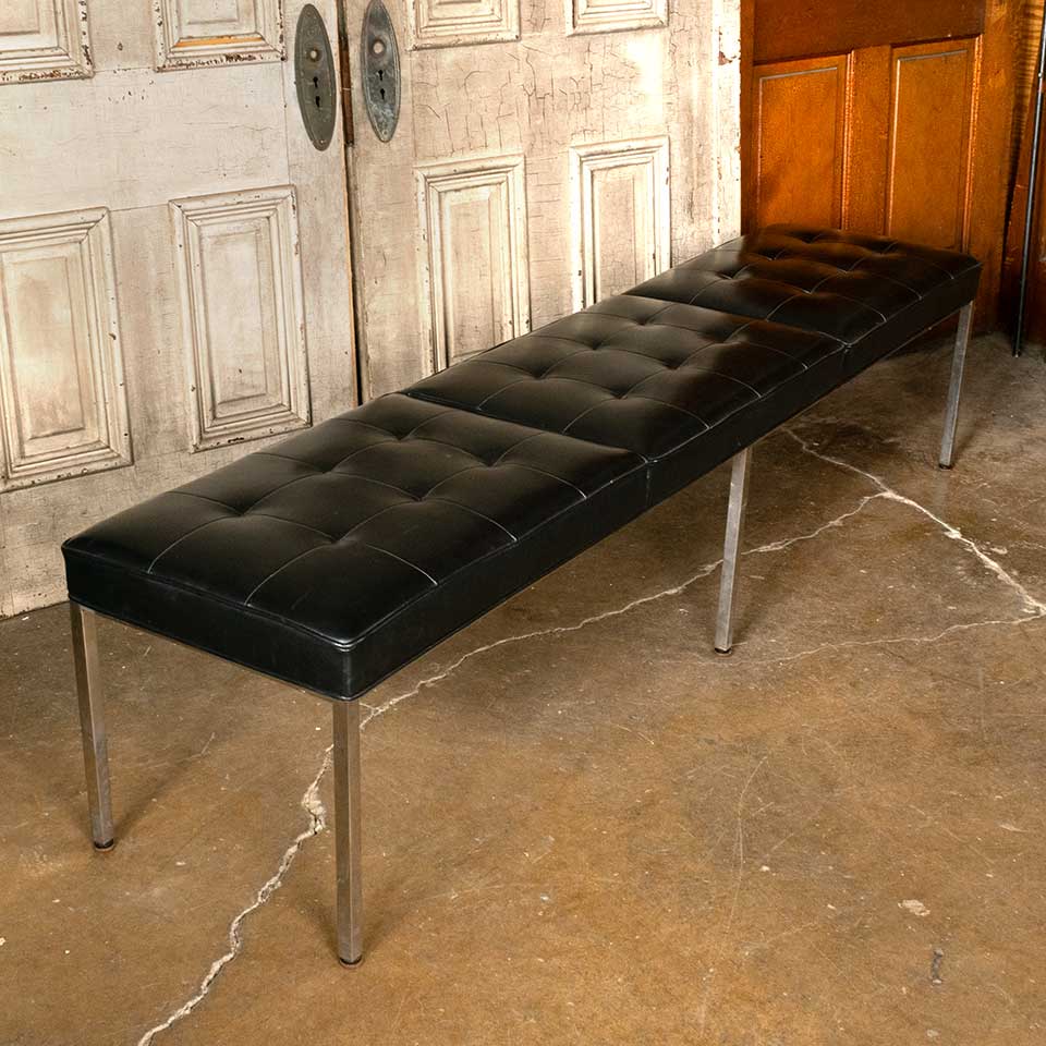 Architectural salvage vintage Mid-Century Modern upholstered bench measuring approx. 82" wide x 18 1/2" tall x 18 1/4" front to back. See photos to evaluate condition.