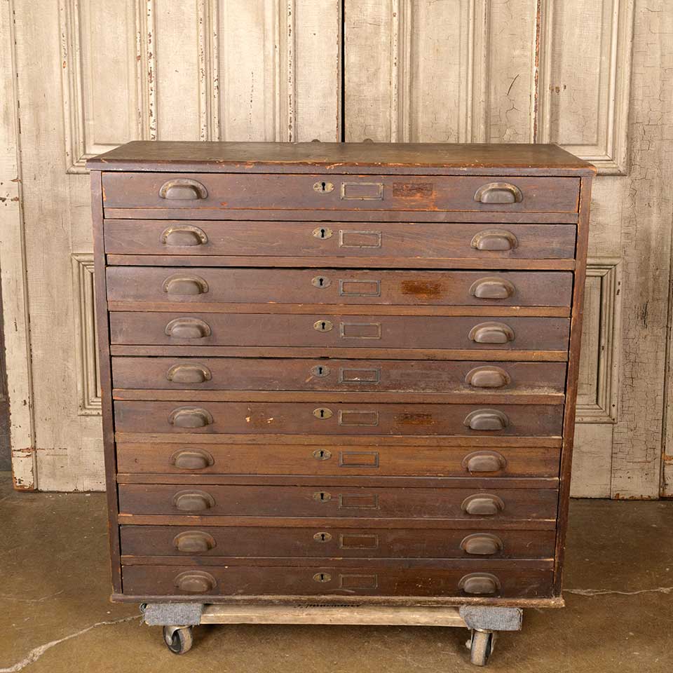 Architectural salvage antique wood flat drawer file cabinet with ten drawers measuring approx. 36" wide x 34 3/4" tall x 15 1/8" front to back. See photos to evaluate condition.