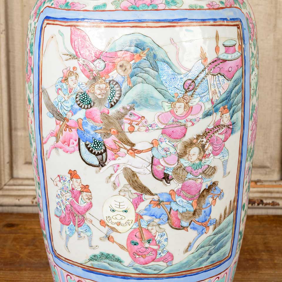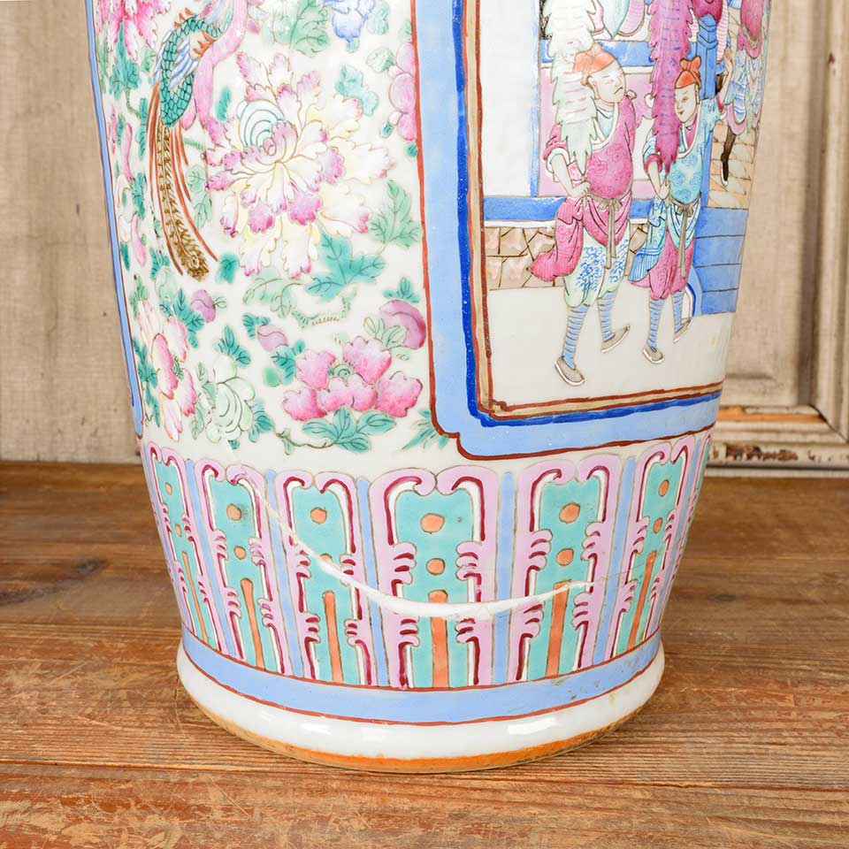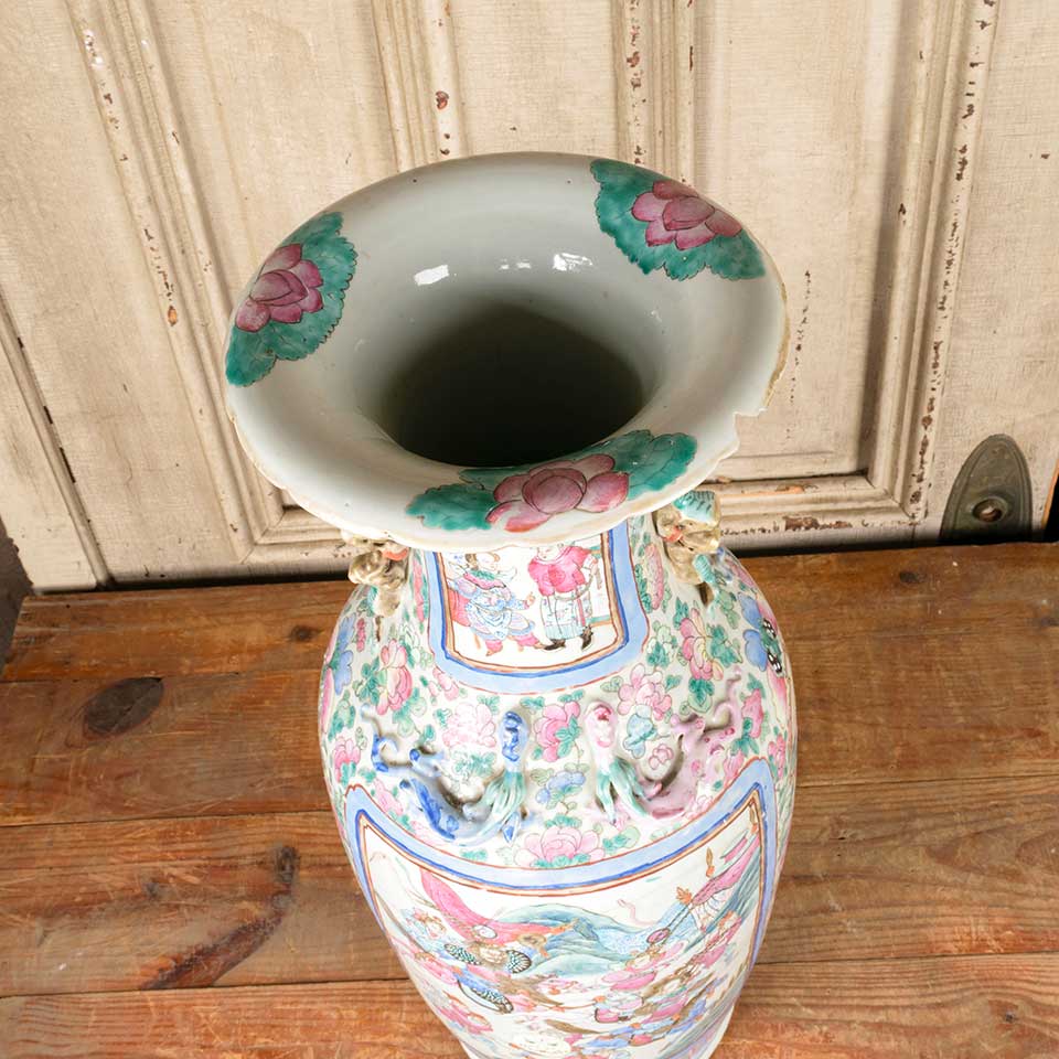 Large antique decorative Chinese porcelain famille rose vase measuring approx. 10" in diameter x 24 5/8" tall with an 8 7/8" diameter top. There are several chips and cracks in this piece. See photos to evaluate condition.