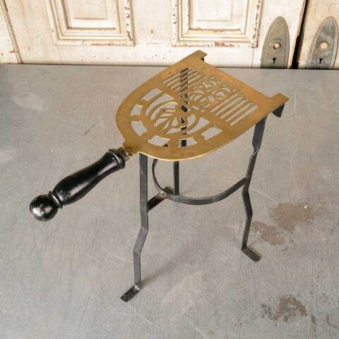 Architectural salvage antique brass and wrought iron fireplace hearth trivet stand measuring approx. 10" wide x 14 1/4" tall x 14 1/2" front to back. See photos to evaluate condition.