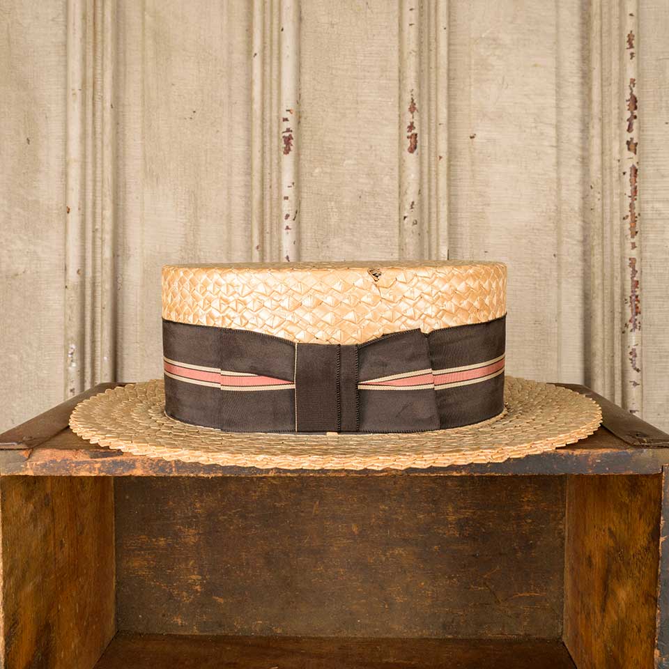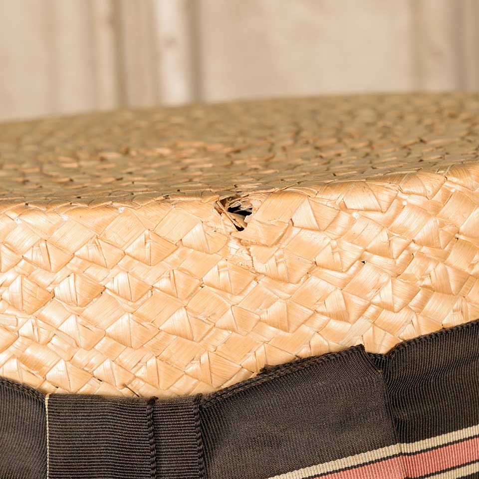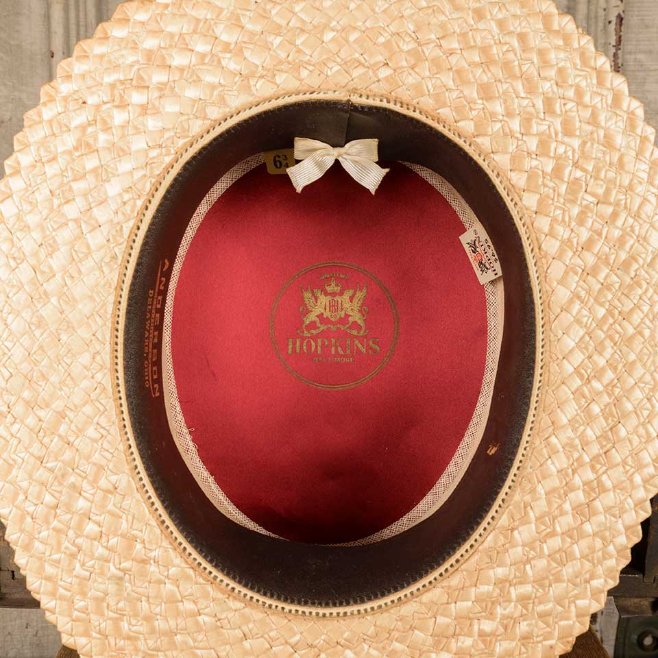 Vintage 1940's HOPKINS BALTIMORE straw hat with striped ribbon measuring approx. 10 1/2" wide x 3 1/2" tall x 12 1/4" front to back. ANDERSON CLOTHING CO. DELAWARE, OHIO is printed on the inside of the hat. There is a small hole on top of hat, see photos to evaluate.