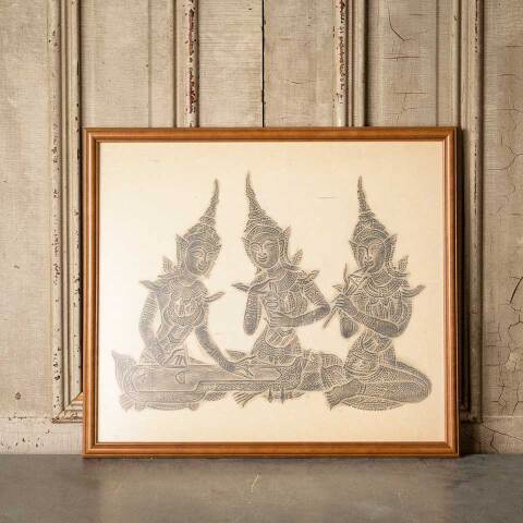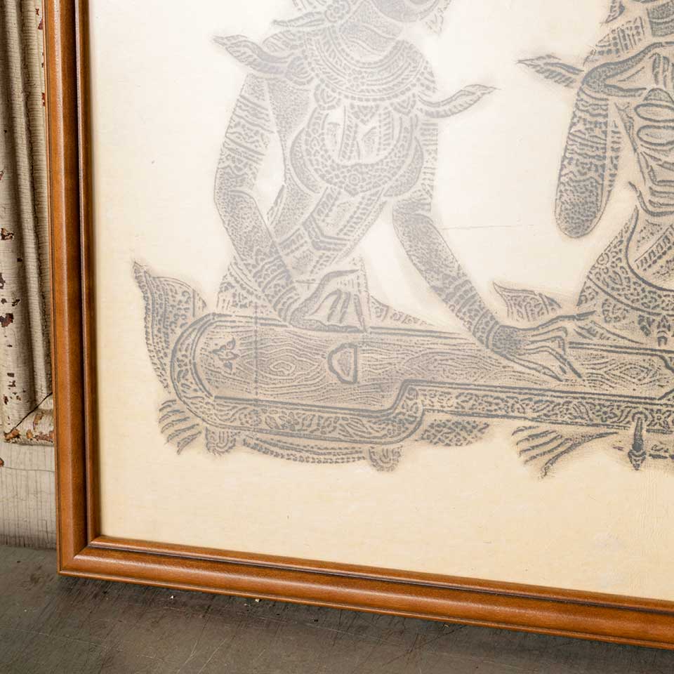 Wood framed Thai temple rubbing artwork measuring approx. 24 3/4" wide x 21 3/4" tall x 7/8" front to back. See photos to evaluate condition.
