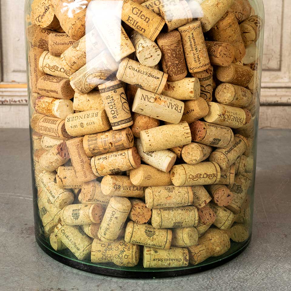 Large glass jar with removable metal lid and filled with wine bottle corks measuring approx. 10 1/2" in diameter x 14 1/4" tall. See photos to evaluate condition.