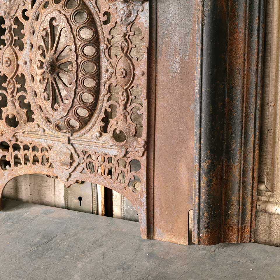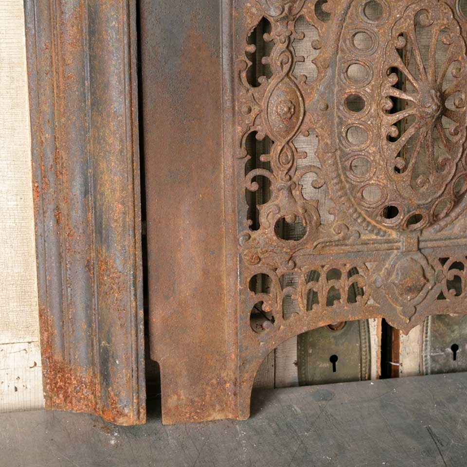 Architectural salvage hard to find antique two piece cast iron fireplace surround and arched top summer front cover set. The fireplace surround measures approx. 27" wide x 37" tall x 2 1/2" front to back. The summer front cover measures approx. 19 15/16" wide (at bottom) x 27" tall x 1 1/2" front to back. See photos to evaluate condition. Priced at $925 for the 2 piece set.