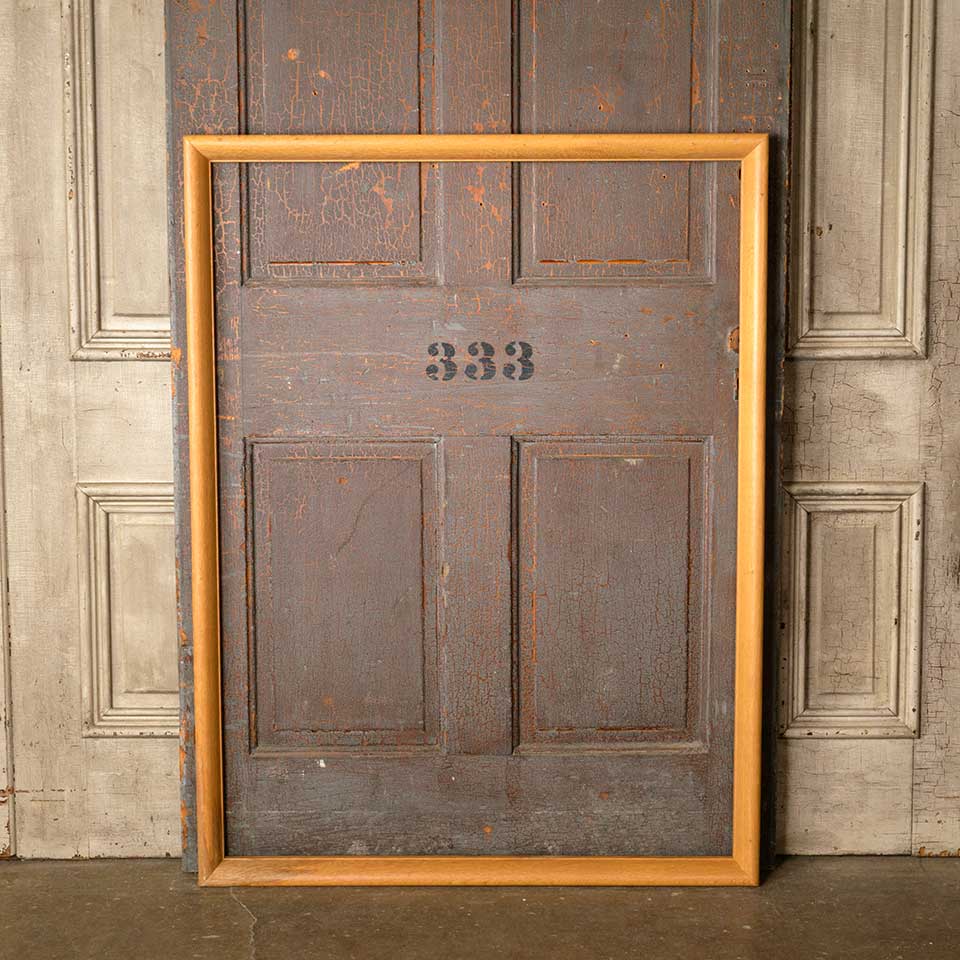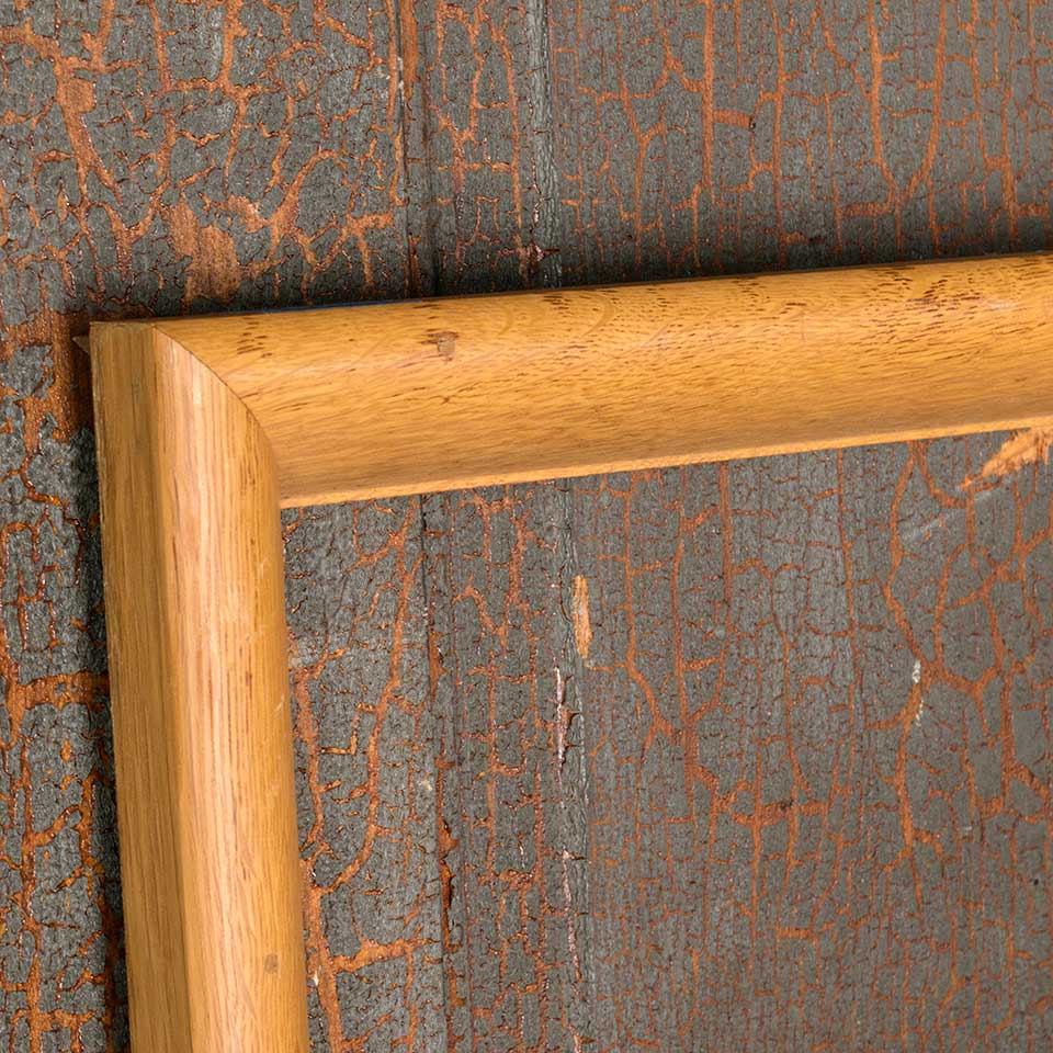 Architectural salvage oak wood trim frame measuring approx. 37 1/2" x 49 3/4" with an opening 34 3/8" x 46 1/2". Color and condition may vary.