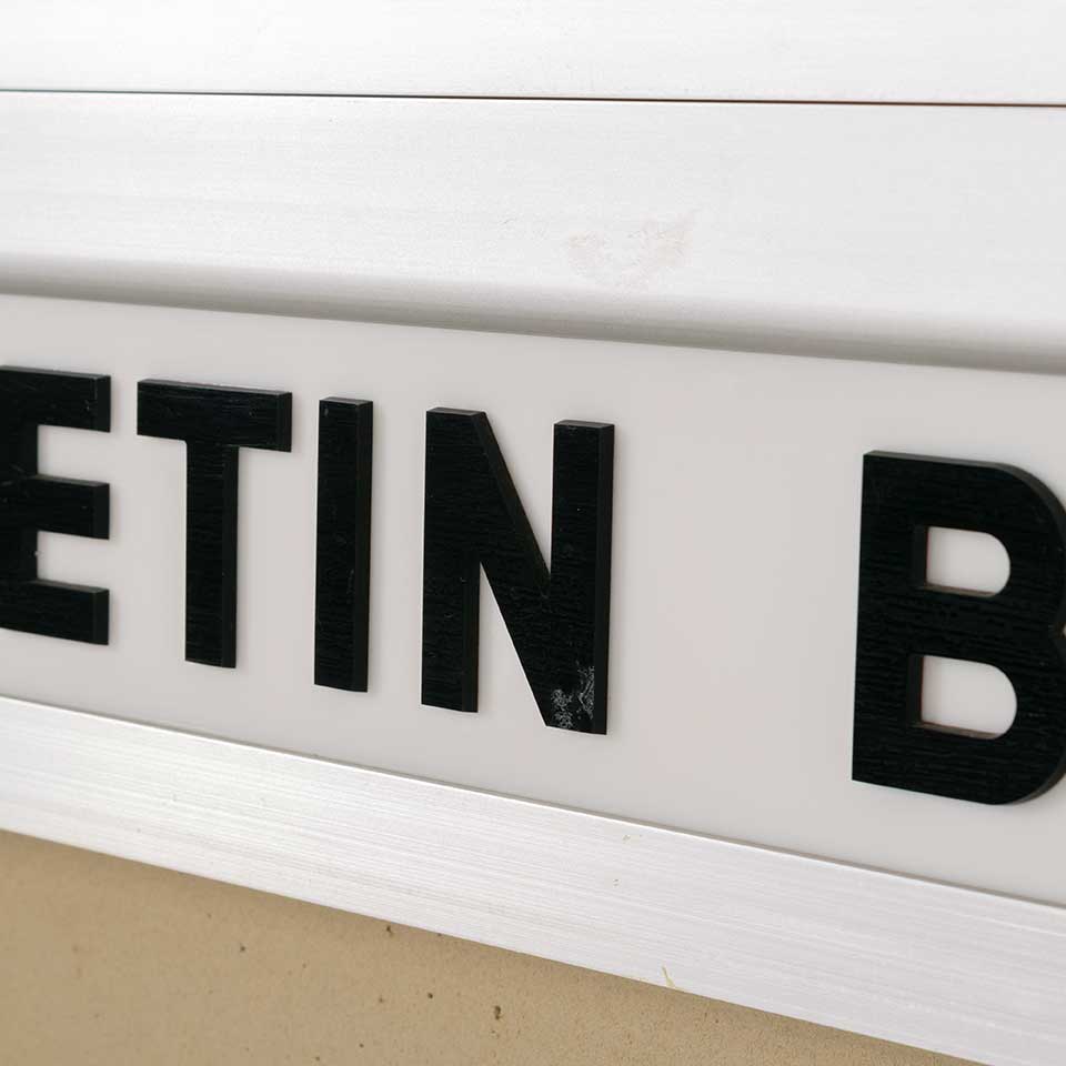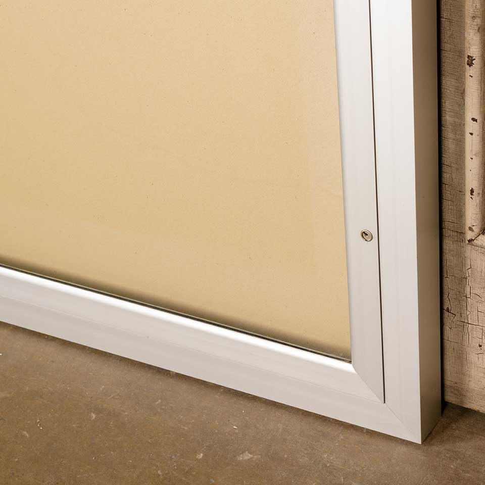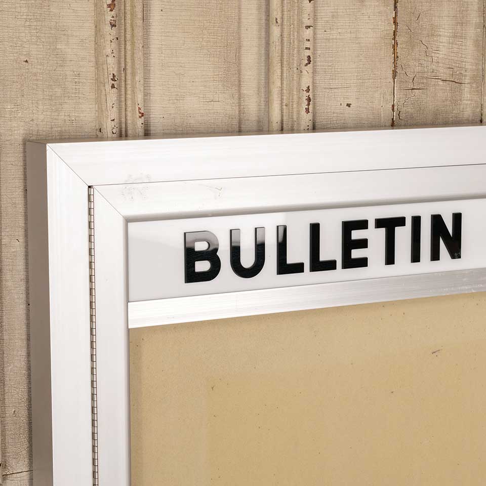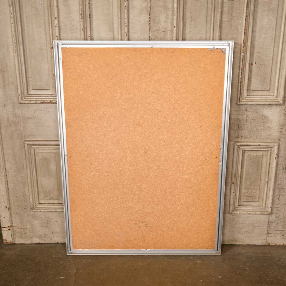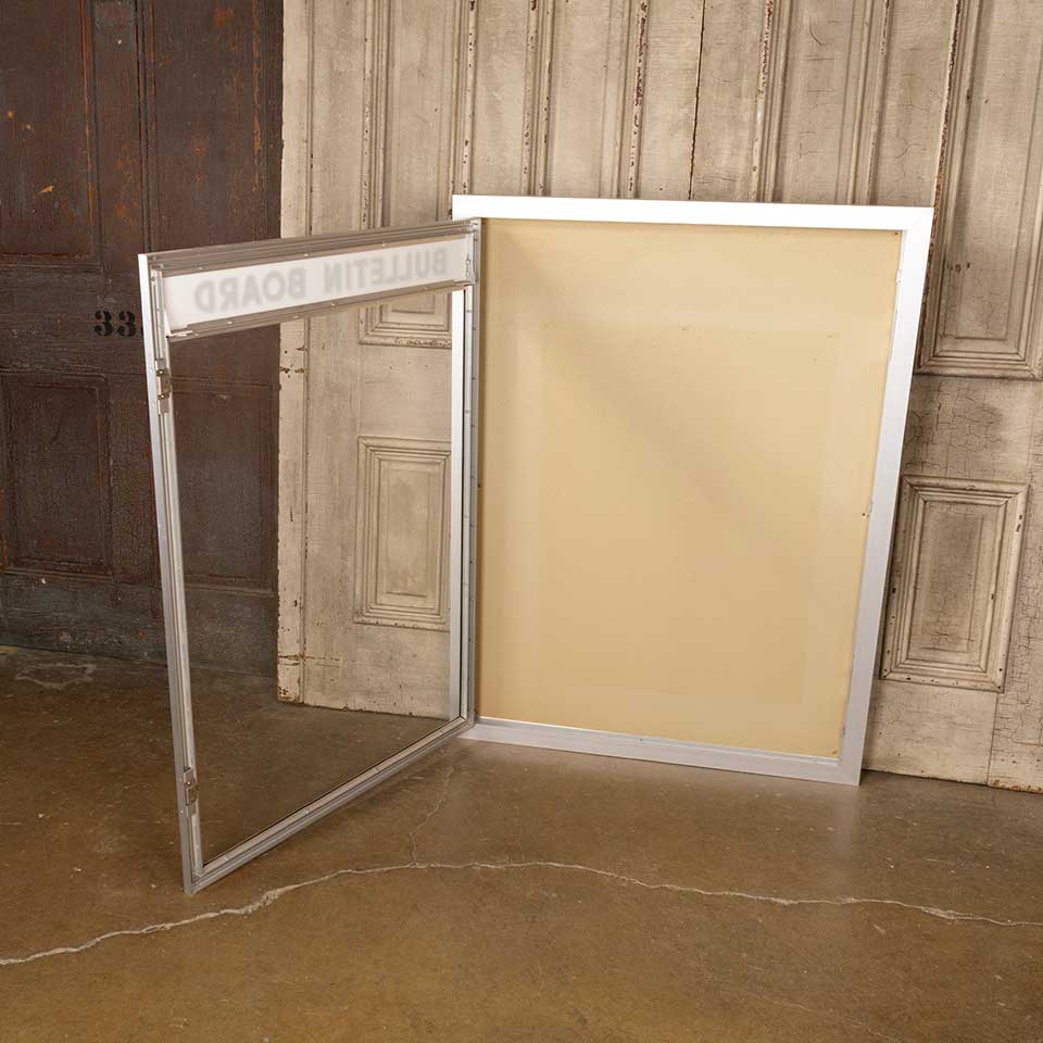 Architectural salvage metal bulletin / notice board wall cabinet with hinged glass door measuring approx. 36" wide x 48" tall x 2" front to back. There is no key for the locks, but the door opens. See photos to evaluate condition.
