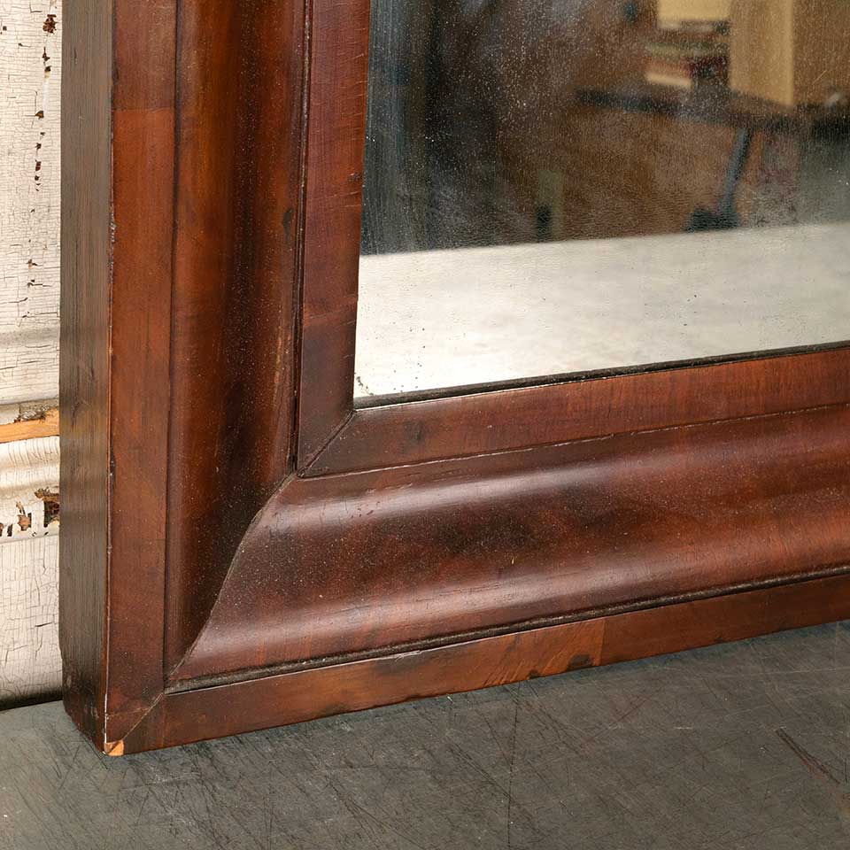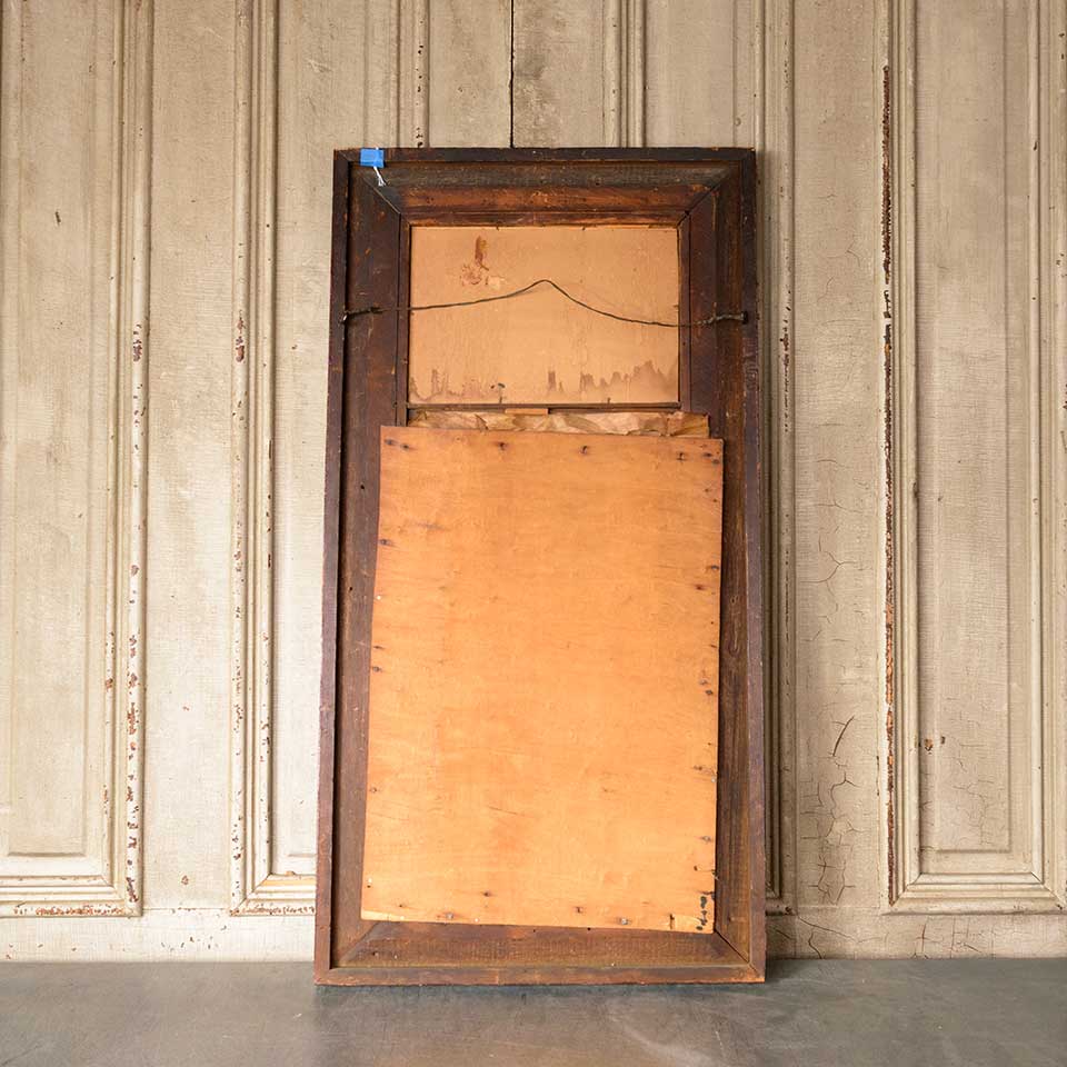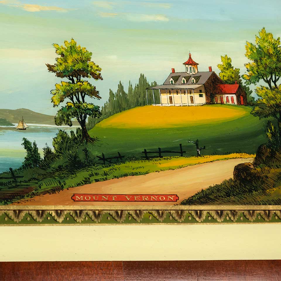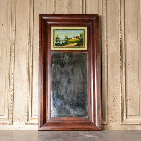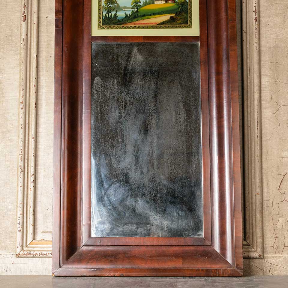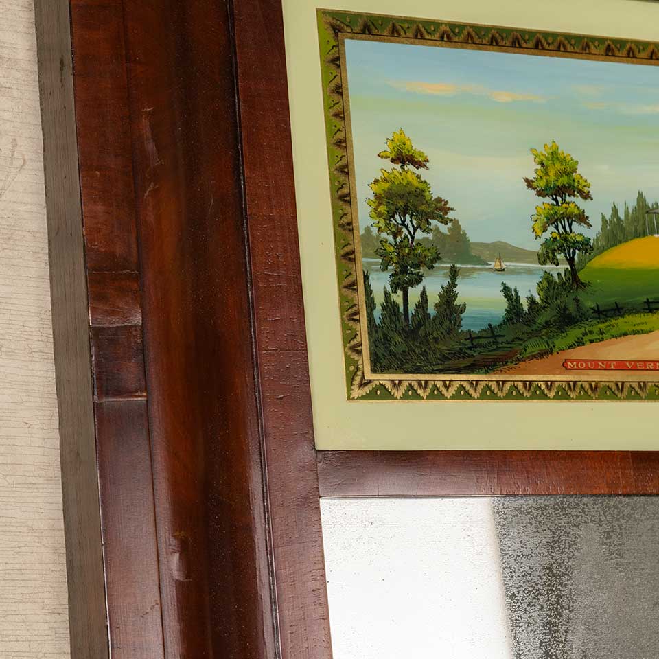 Antique wood framed eglomise mirror with painted scene of George Washington's Mount Vernon measuring approx. 21 3/16" wide x 40 3/4" x 1 13/16" front to back. There's some veneer loss at the top right corner. See photos to evaluate condition.
