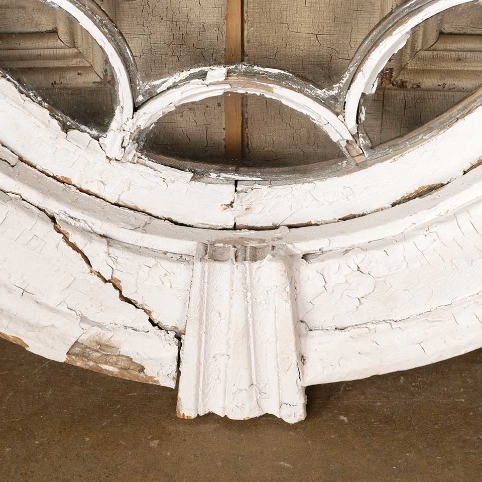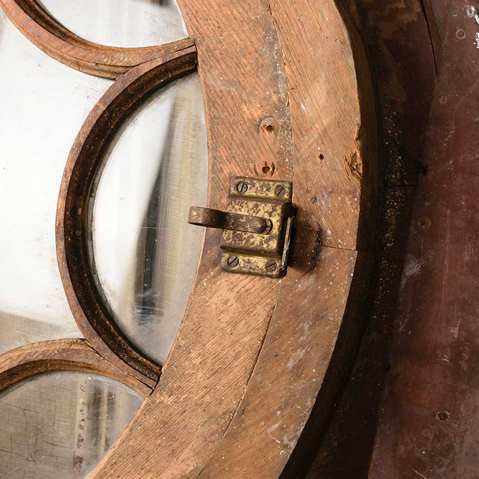 Architectural salvage antique round divided lite operable wood window unit with exterior casing trim measuring approx. 37 1/4" in diameter x 5" front to back (overall dimensions). There's one cracked pane of glass. See photos to evaluate condition.
