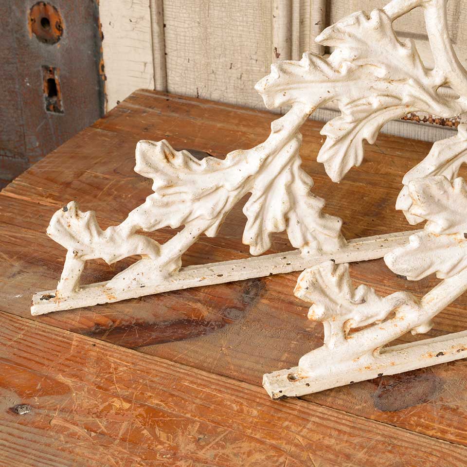 Set of two architectural salvage vintage painted cast iron wall brackets each measuring approx. 1" wide x 22 1/4" tall x 21 5/8" front to back. There are some broken off pieces. See photos to evaluate condition. Priced at $75 for the two piece set.