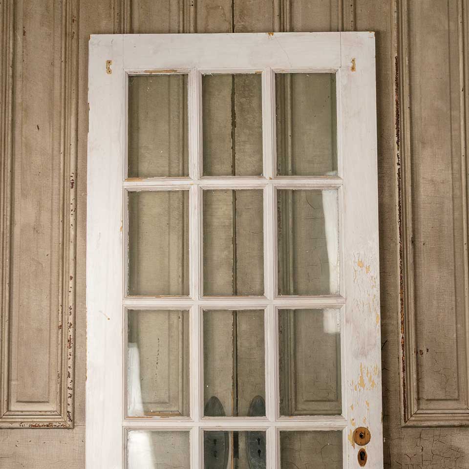 Architectural salvage antique painted wood fifteen lite French door with mortise lock measuring approx. 33 3/4" wide x 81" tall x 1 3/8" thick. See photos to evaluate condition.